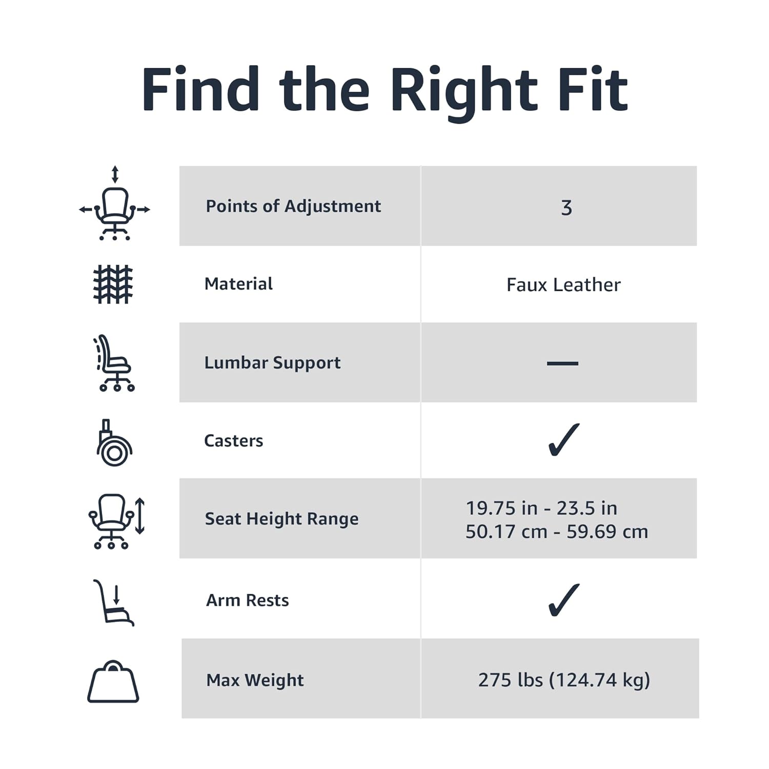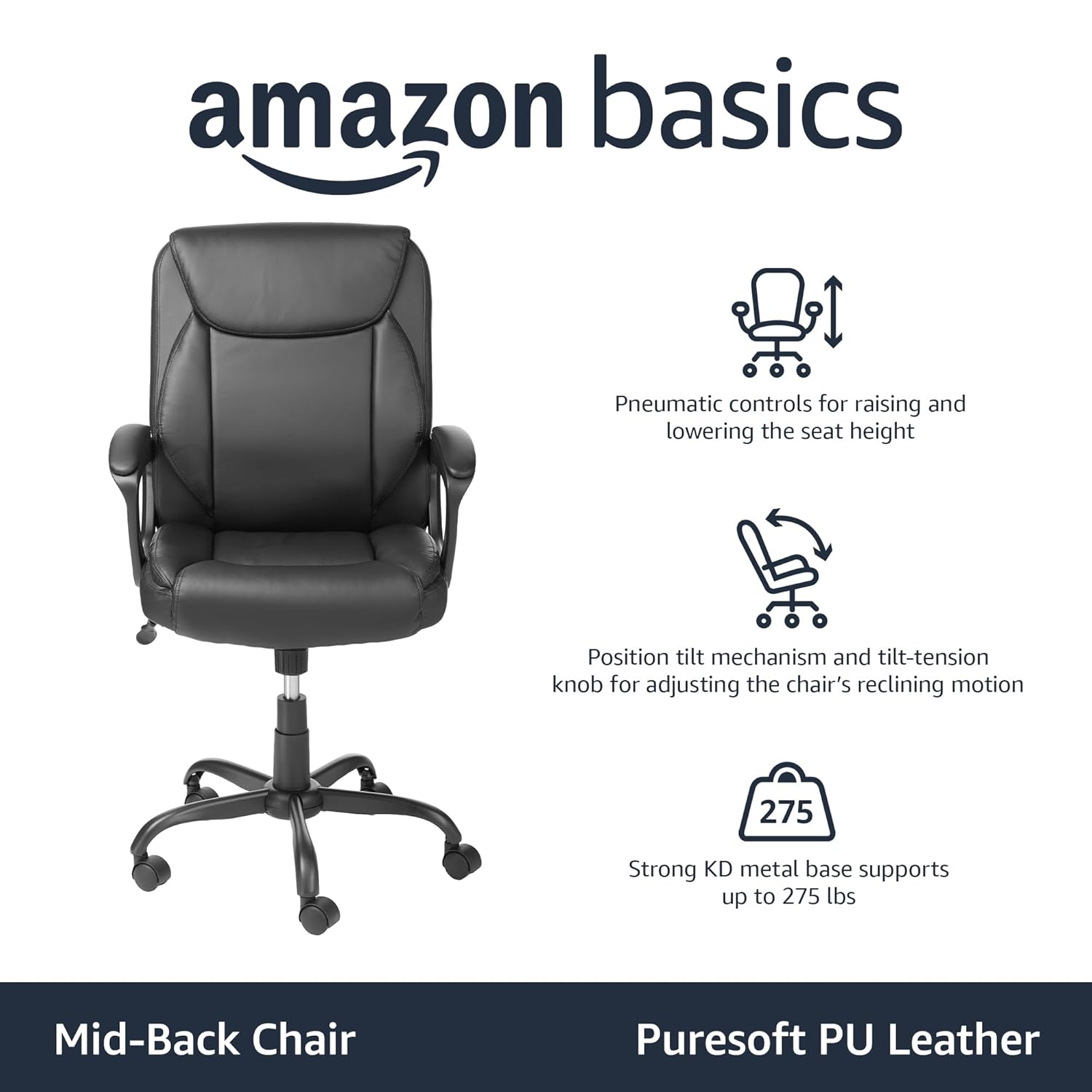 AmazonBasics Classic Leather-Padded Mid-Back Office Computer Desk Chair with Armrest – Black, BIFMA Certified