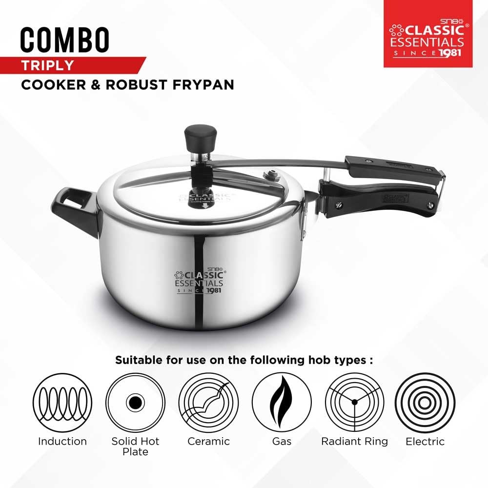 Triply Construction: Both the frypan and pressure cooker feature a Triply construction, implying three layers of metal. This design ensures efficient heat distribution, preventing hot spots and promoting uniform cooking.