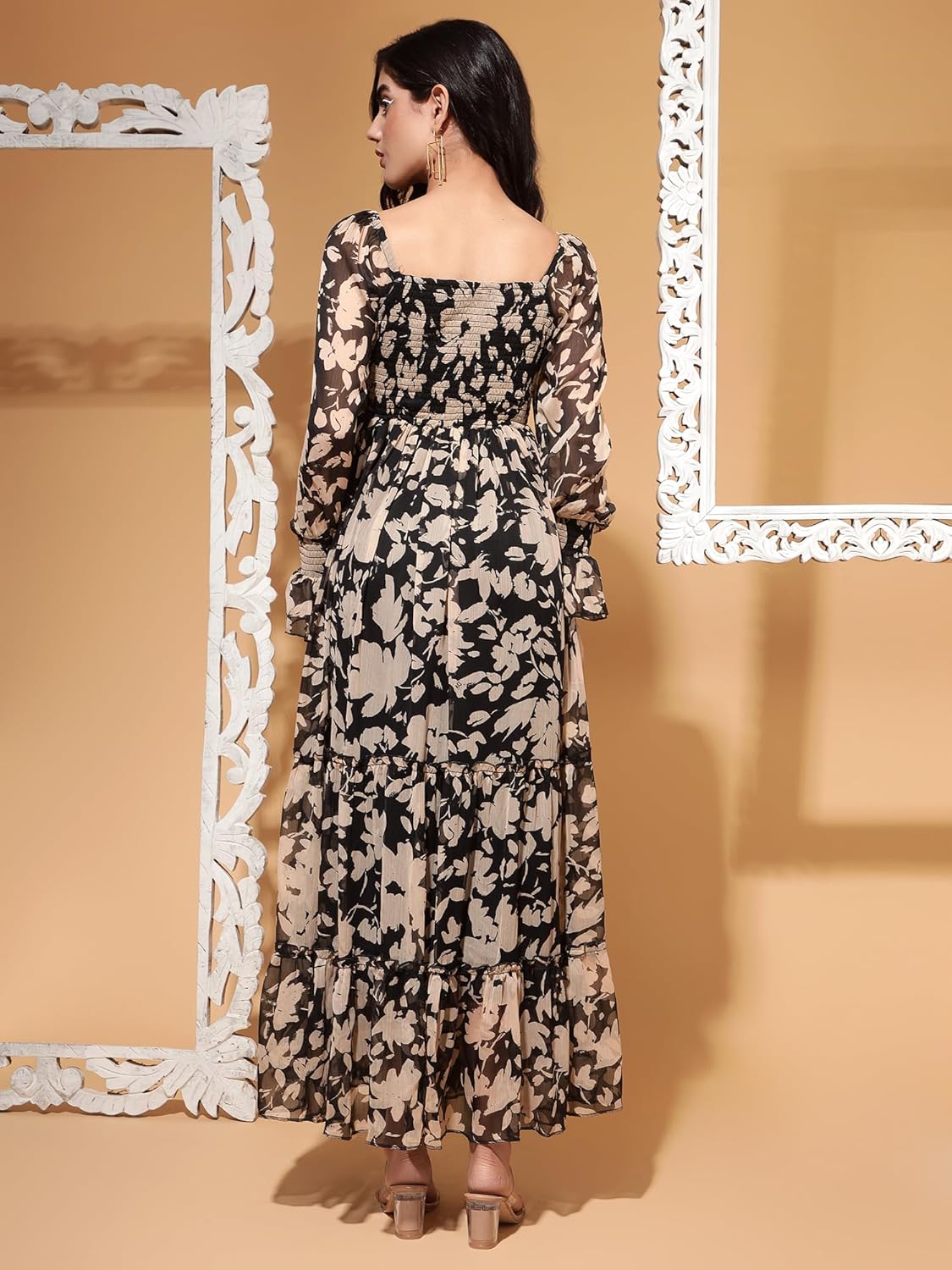 DRAPE AND DAZZLE Presenting Printed Smocked Tier Dress With Sleeve These Fabric Is Chiffon 100% Polyester. These trendy dresses are a pure stunner and makes an everlasting statement whenever you wear it. This gives you flawless shape and flows with the body all day long. A pair of nice pumps and chandelier earrings will complete this gorgeous look! adorned with a contemporary style, this dress showcases more feminine effect. While the refined color scheme makes it visually appealing. Designed to excellence, it will surely complement your curvaceous figure. Make your date special as you flaunt your beauty in this dress. Slip into this ,designer trendy , latest and attractive Striped/ Floral print comfortable long mexi dress from DRAPE AND DAZZLE and look stylish effortlessly. Made for any body type, it will give you that extra confidence and make you stand out wherever you are. Keep the accessories minimal for that added elegant look, just your favorite heels and dangling earrings, and of course, dont forget your pretty smile.Garment is made of Chiffon 100% Polyester, and Has a U designer Neck ,Full Sleeve, can wear at party as well as casual , festival and other occasions.The dress looks pretty good and exactly the same as in the picture.