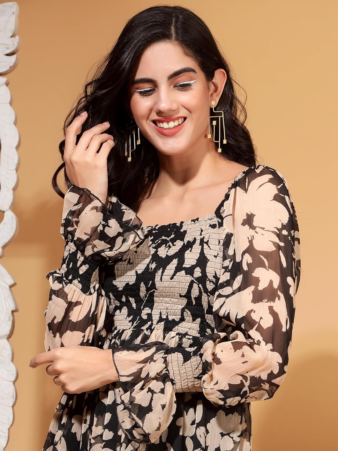 DRAPE AND DAZZLE Presenting Printed Smocked Tier Dress With Sleeve These Fabric Is Chiffon 100% Polyester. These trendy dresses are a pure stunner and makes an everlasting statement whenever you wear it. This gives you flawless shape and flows with the body all day long. A pair of nice pumps and chandelier earrings will complete this gorgeous look! adorned with a contemporary style, this dress showcases more feminine effect. While the refined color scheme makes it visually appealing. Designed to excellence, it will surely complement your curvaceous figure. Make your date special as you flaunt your beauty in this dress. Slip into this ,designer trendy , latest and attractive Striped/ Floral print comfortable long mexi dress from DRAPE AND DAZZLE and look stylish effortlessly. Made for any body type, it will give you that extra confidence and make you stand out wherever you are. Keep the accessories minimal for that added elegant look, just your favorite heels and dangling earrings, and of course, dont forget your pretty smile.Garment is made of Chiffon 100% Polyester, and Has a U designer Neck ,Full Sleeve, can wear at party as well as casual , festival and other occasions.The dress looks pretty good and exactly the same as in the picture.