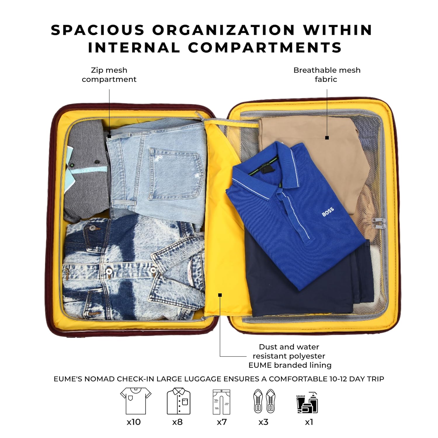 The Eume Nomad travel bags for luggage trolley are crafted from polypropylene, ensuring unmatched durability and resistance. These trolley bags for travel are lightweight, yet this luggage trolley are also resistant to fractures, chemicals, and severe temperatures, providing unsurpassed protection for your valuables in these travel bags trolley. With the ability to expand by up to 5cm, these trolley bags for travel effortlessly accommodate extra items, meeting diverse packing needs with ease.
