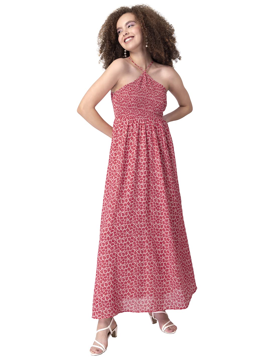 With a cute print and a breezy silhouette, this red maxi dress makes for the perfect pick for sunny days. Tailored in a refreshing floral print, it comes with a smocked bodice and a halter neck.