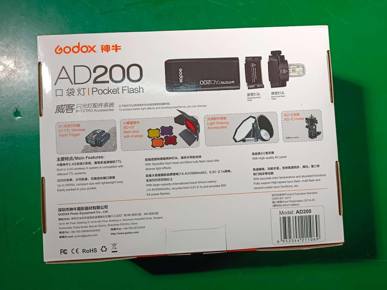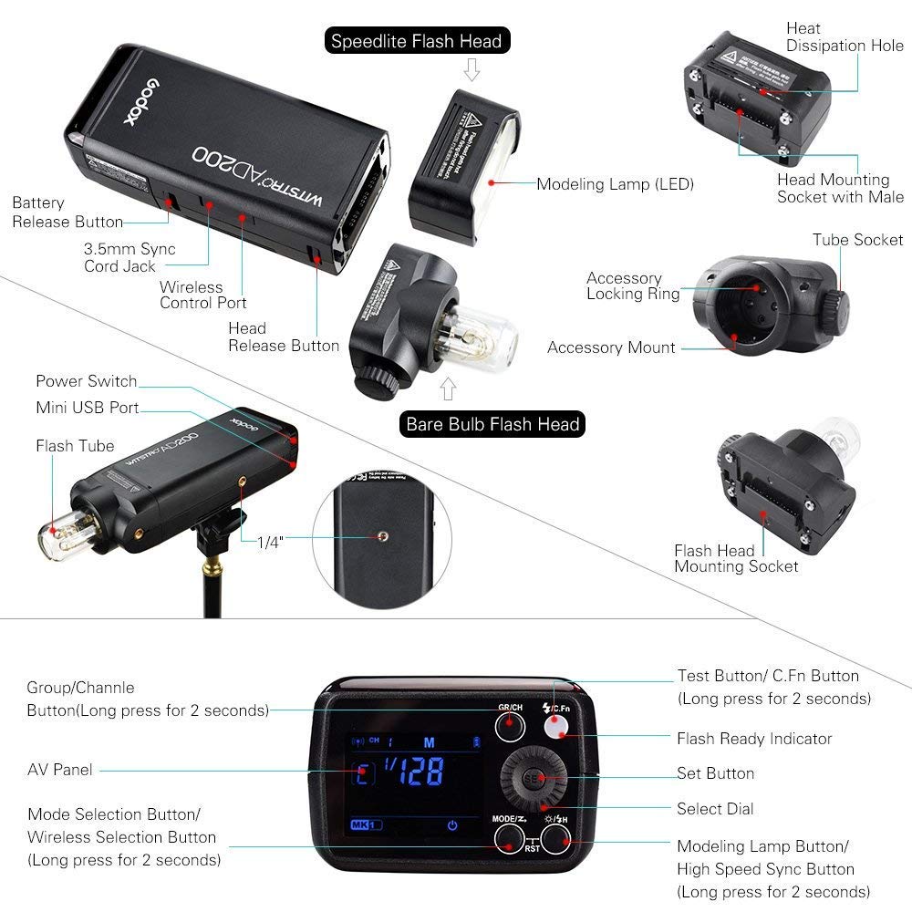 Package included: 1 – AD200 Flash Body. 1 – Speedlite , 1 – Bare Bulb Head, 1 – Bare Bulb Head Flash Tube, 1 – Battery, 1 – Charger, 1 – Power Cable, 1 – Tilt Bracket, 1 – Carry Case, 1 – SD card holder (which can hold 4 CF cards and 18 SD cards)