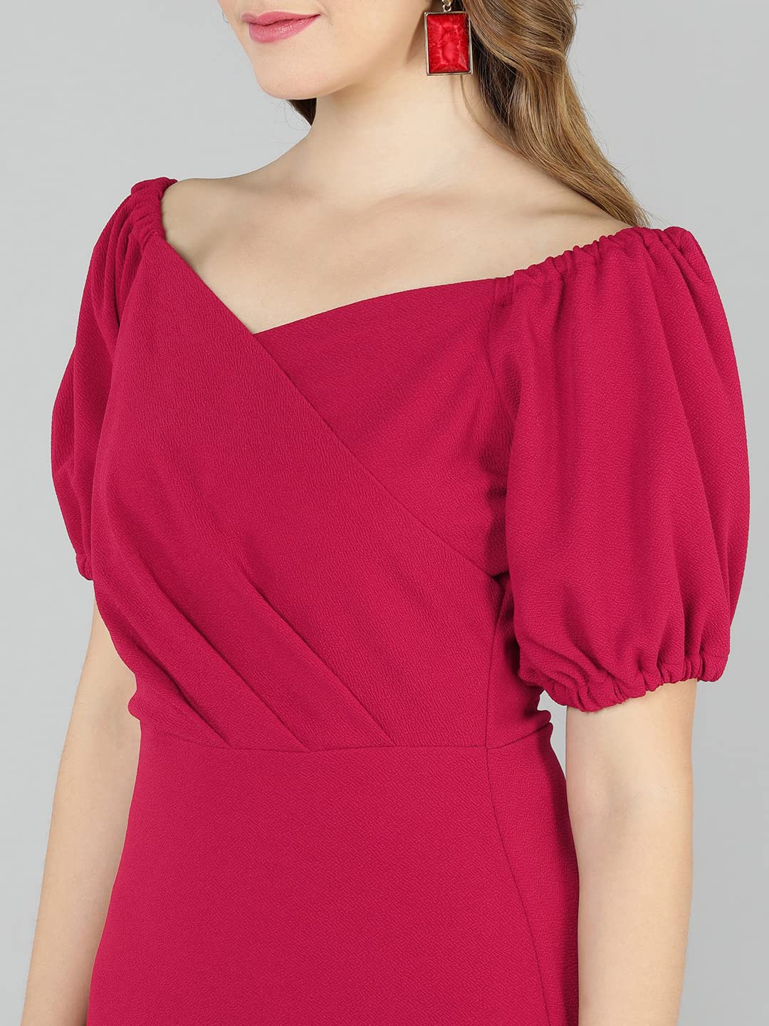 Golden Kite Solid Front Wrap Dress has a Ballon Sleeve, Enhance the style factor of your wardrobe with this stylish dress. It flaunts power shoulders front pleated that lend a bold look while the texture design add to the charm. This Front Wrap Power shoulders Pleated Bodycon dress is made of polyester and can be machine washed.