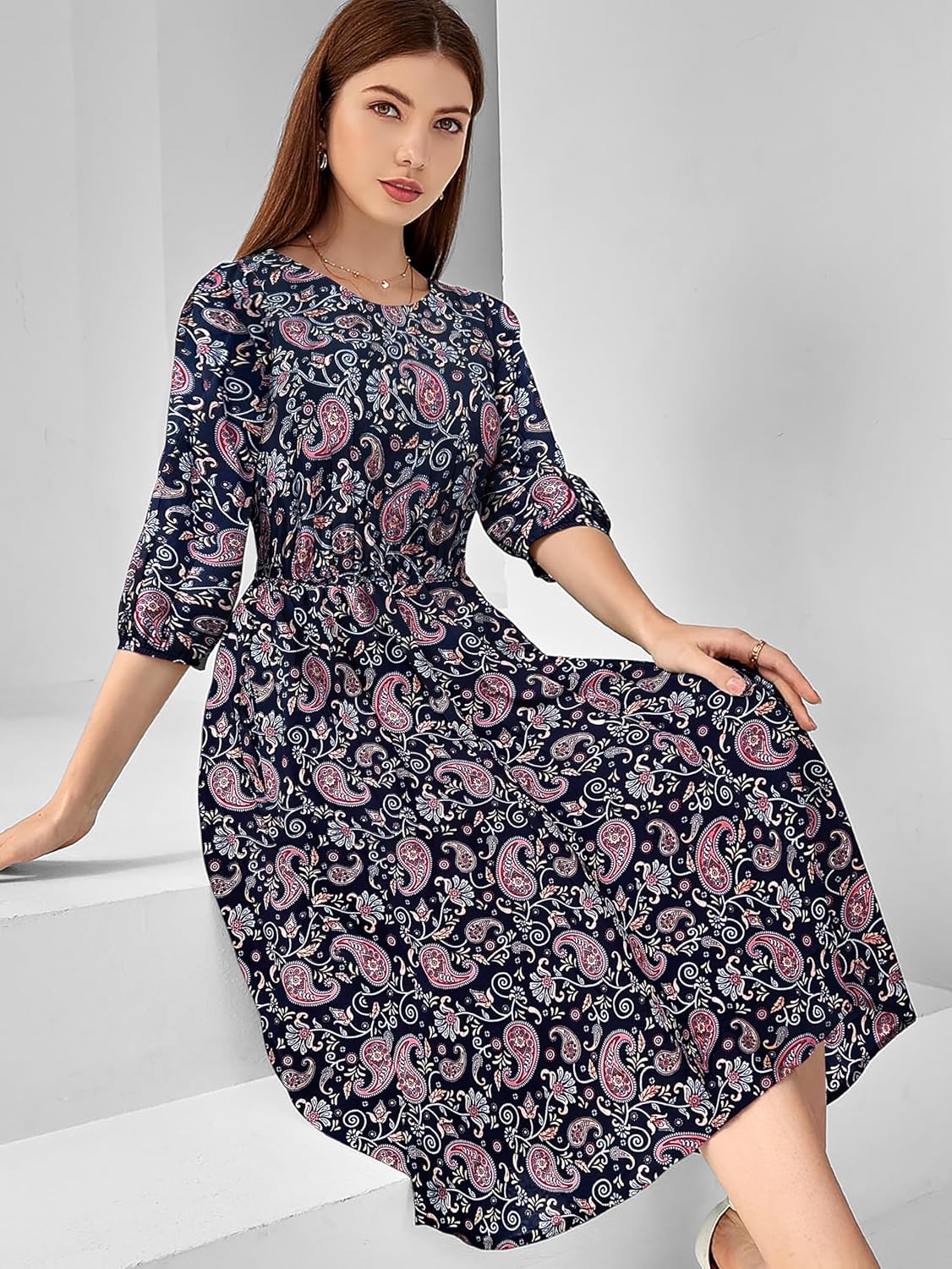 KERI PERRY Women’s Navy Blue Rayon Paisley Print Fit & Flared Western Dress | Dress for Women | A line Dress | Winter Dress | Western Dress | Latest Women Dress | Trendy Dress | Midi Dress