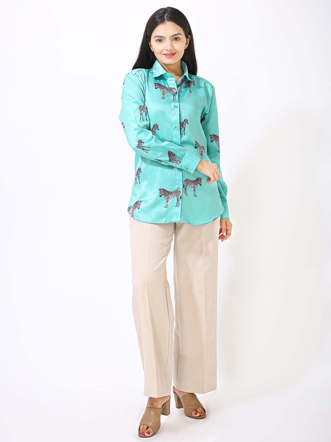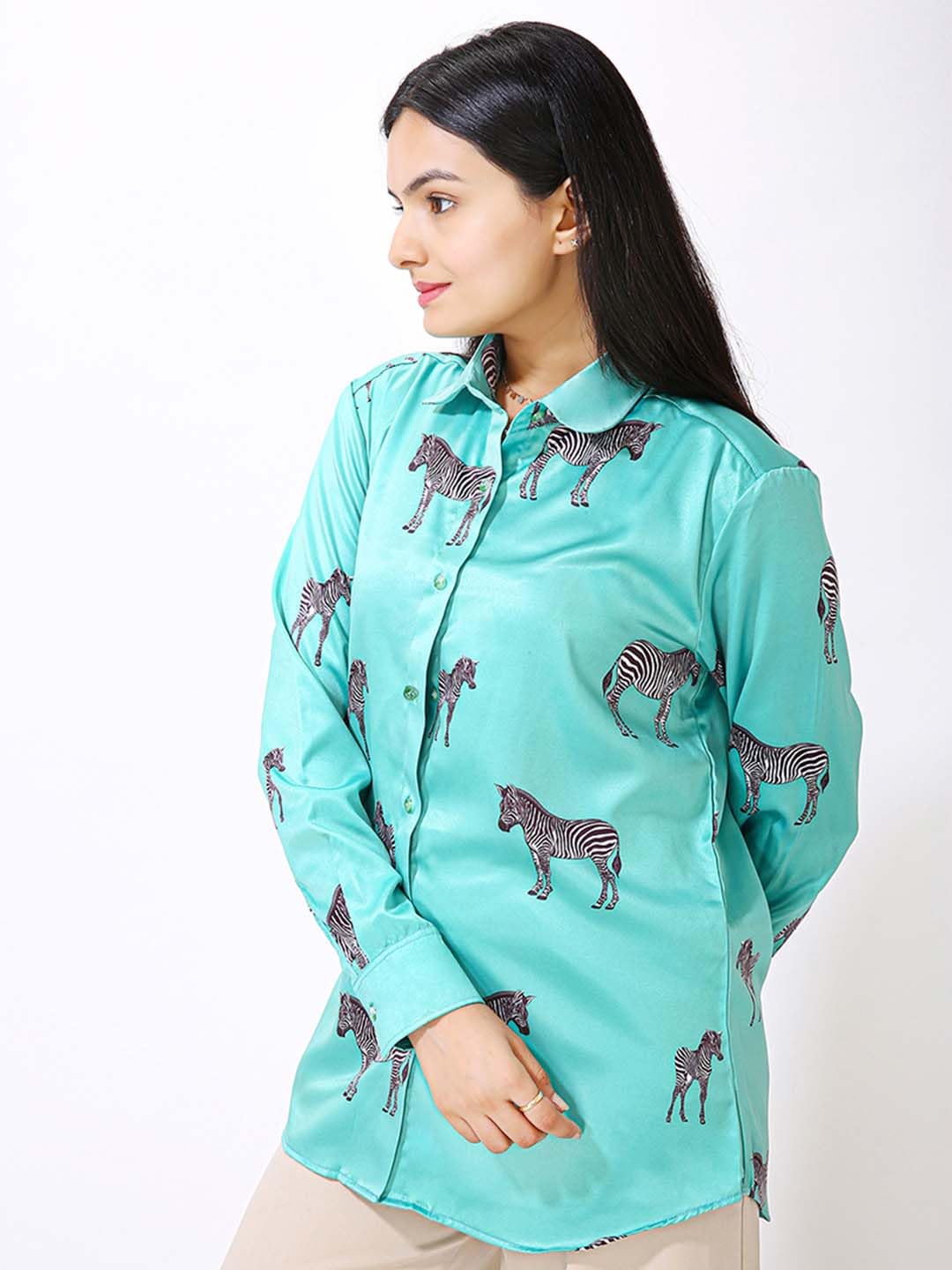 Material: The shirt is made of satin, a smooth, glossy fabric. Satin fabric is known for its luxurious feel and shiny appearance.Color: The base color of the shirt is aqua green, which is a soft, vibrant hue that gives a fresh and lively look.Design/Pattern: The shirt features a pattern of zebras printed all over it. The zebras are designed in a black-and-white color scheme, which contrasts well against the aqua green background.Fit and Style: The shirt has a relaxed, comfortable fit, suitable for both casual and semi-formal occasions. It has a button-down front, long sleeves, and a classic collar, contributing to its sophisticated yet playful look.
