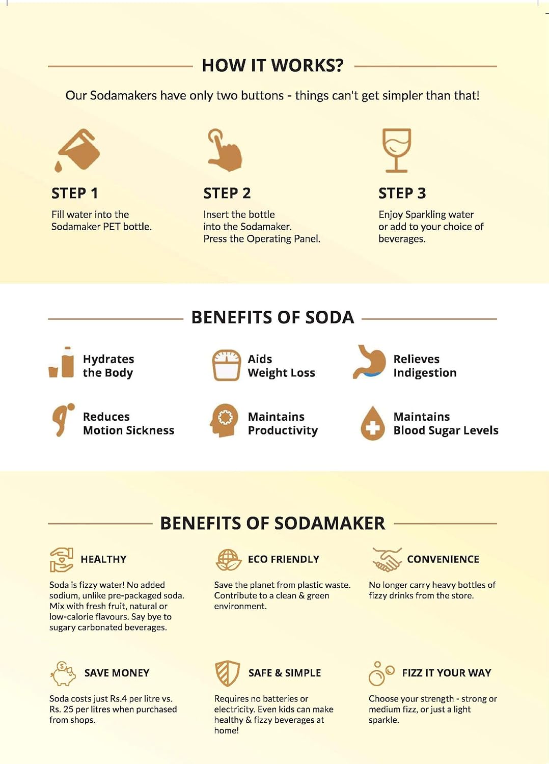 One pack includes one Sodamaker, 2 nos of CO2 cylinder that can make around 25 Litres or 125 glasses of soda out of each cylinder and one 500ml PET Bottle. Once the CO2 cylinder is empty, it can be exchanged for a full cylinder at your nearest stockist paying only a nominal amount for the gas.