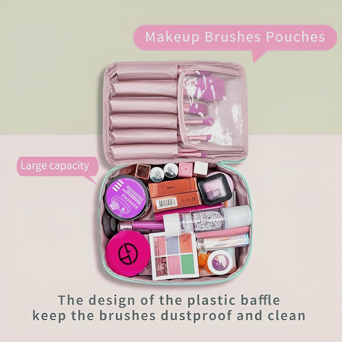 Multiple Layer Organization : This Travel Toiletry Bag contains 3 compartments, one main large compartment,Separate Brushes Compartment and detachable mackup pouch.This Makeup Bag have enough space to storage your makeup and cosmetic accessories, like lipstick, lip gloss, eyeshadow, makeup brushes , makeup palettes, hairbrushes, nail polish,skin care products , nail art tools, shampoo and so on.