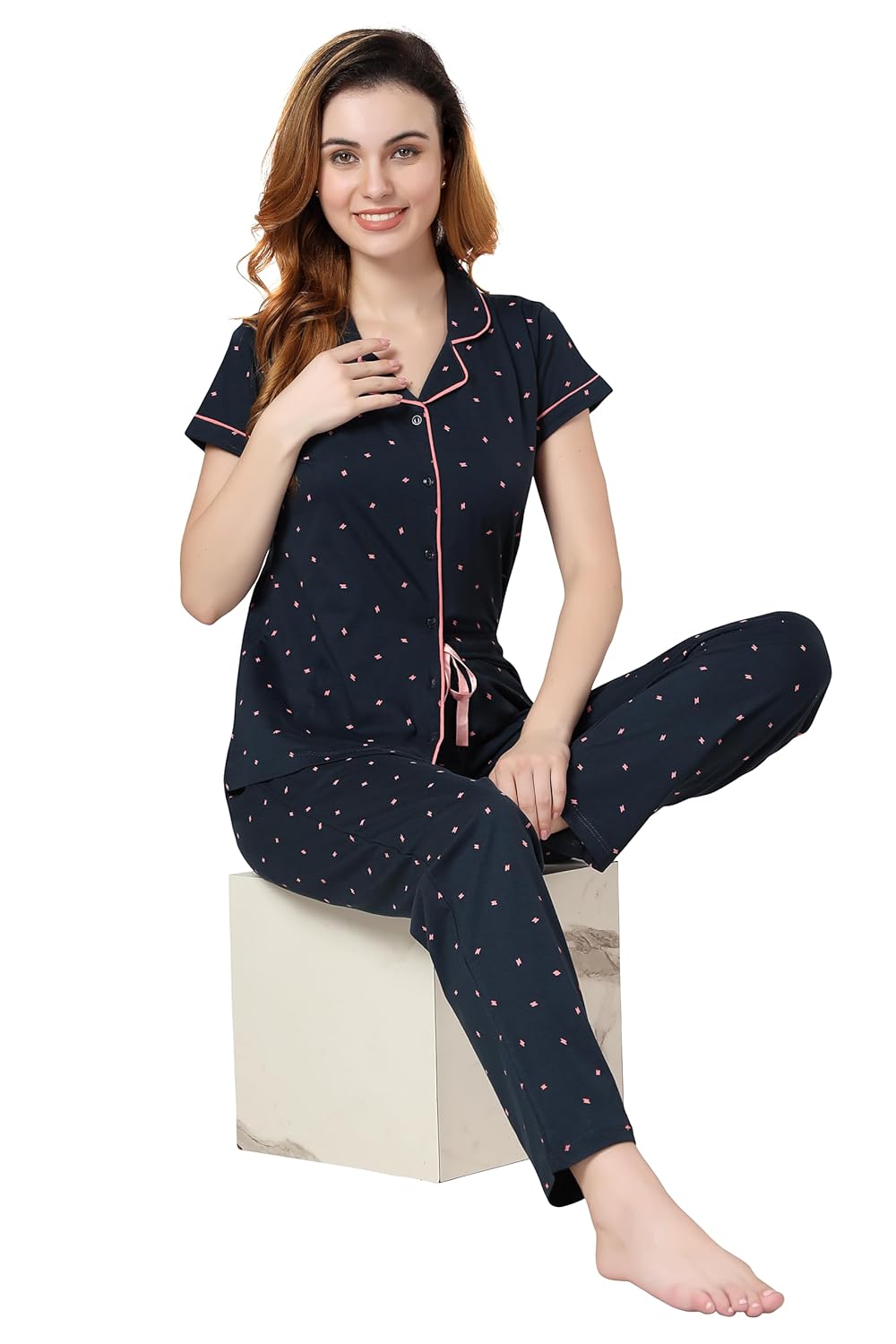 ntroducing our latest collection of nightwear essentials! Crafted from 100% hosiery cotton, our brand nightview shirt and pajama set guarantees a comfortable and cozy night’s sleep. With its half sleeves and collor neck, it’s perfect for all seasons. The top features a stylish screen print, making it a fashionable choice for bedtime. Get yours today!