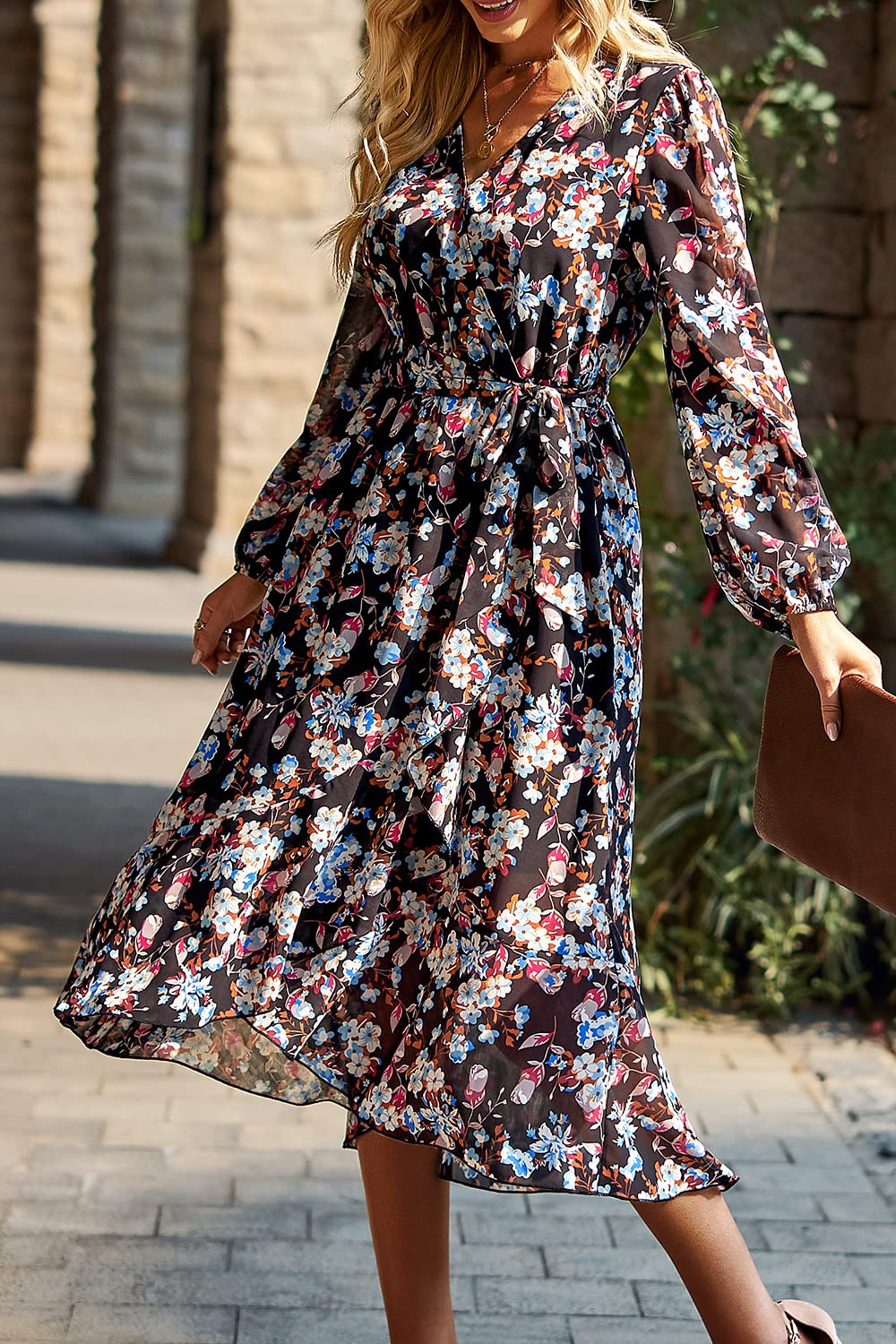 Fashion Style: Long Sleeve/V Neck/Floral Print/Elastic Waist/Ruffled Hem/Layer Dress/With Belt