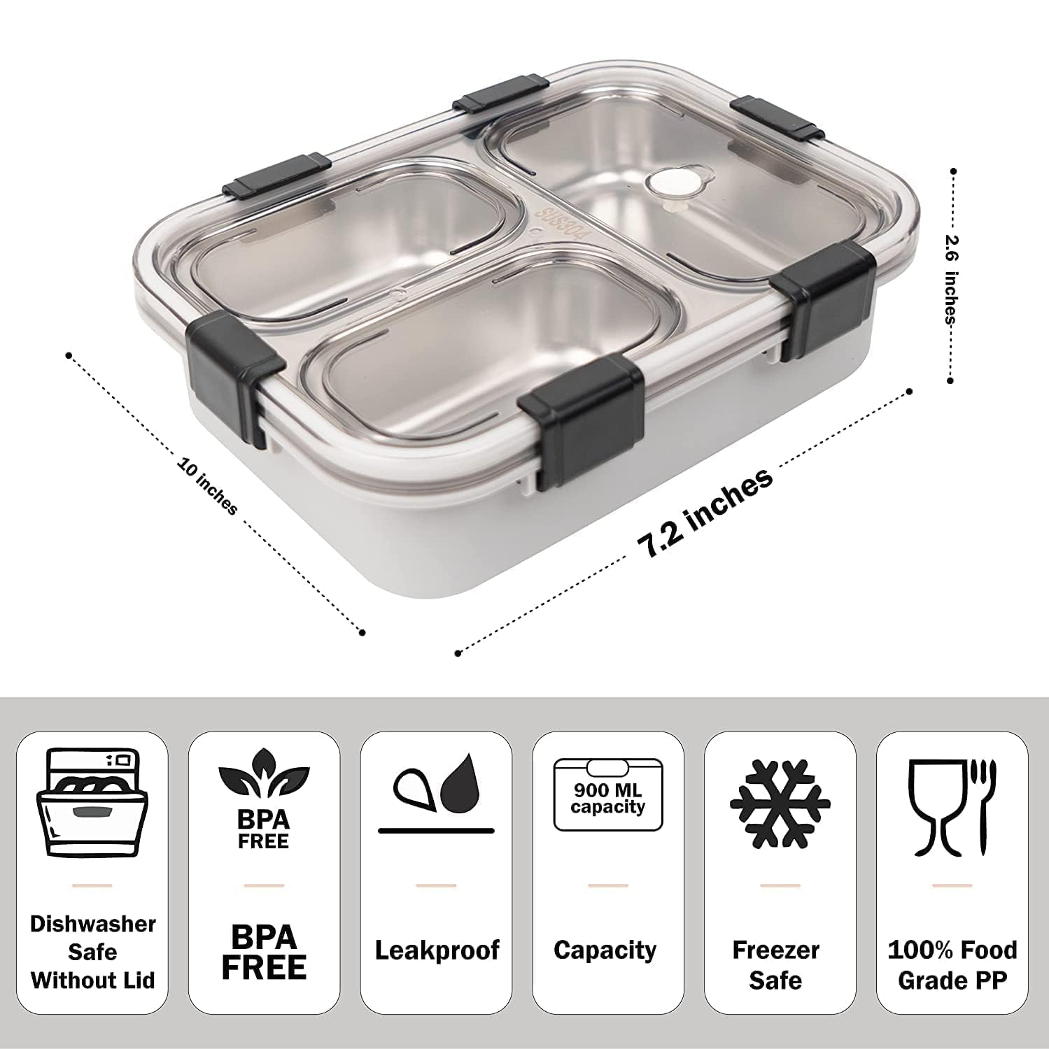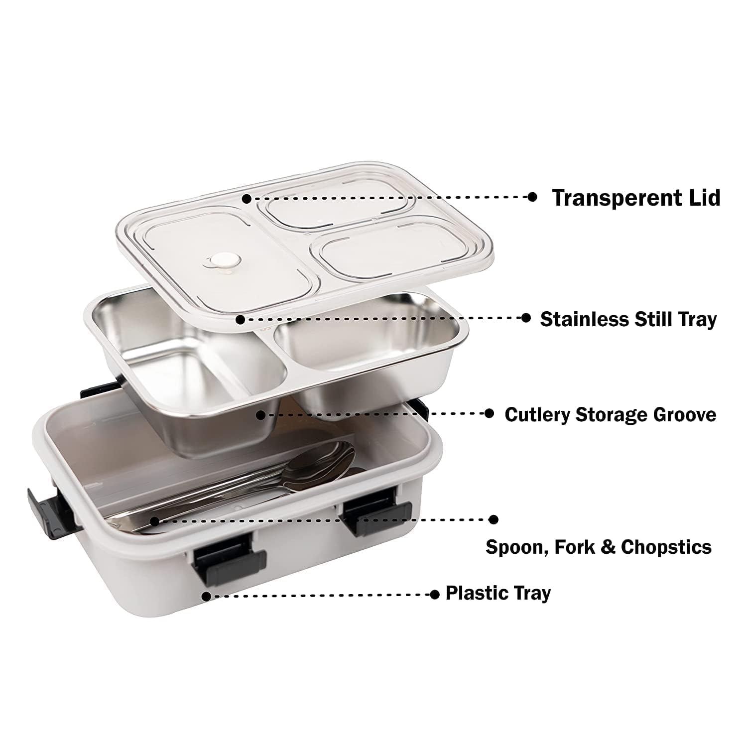 PRIME DEALS Lunch Box Sealed Leakage Proof Stainless Steel Lunch Box with Fork,Chopstick & Spoon Lid Office Food Container 3 Compartment for School Kids and Adults, 750ml (3 Compartment, Grey)