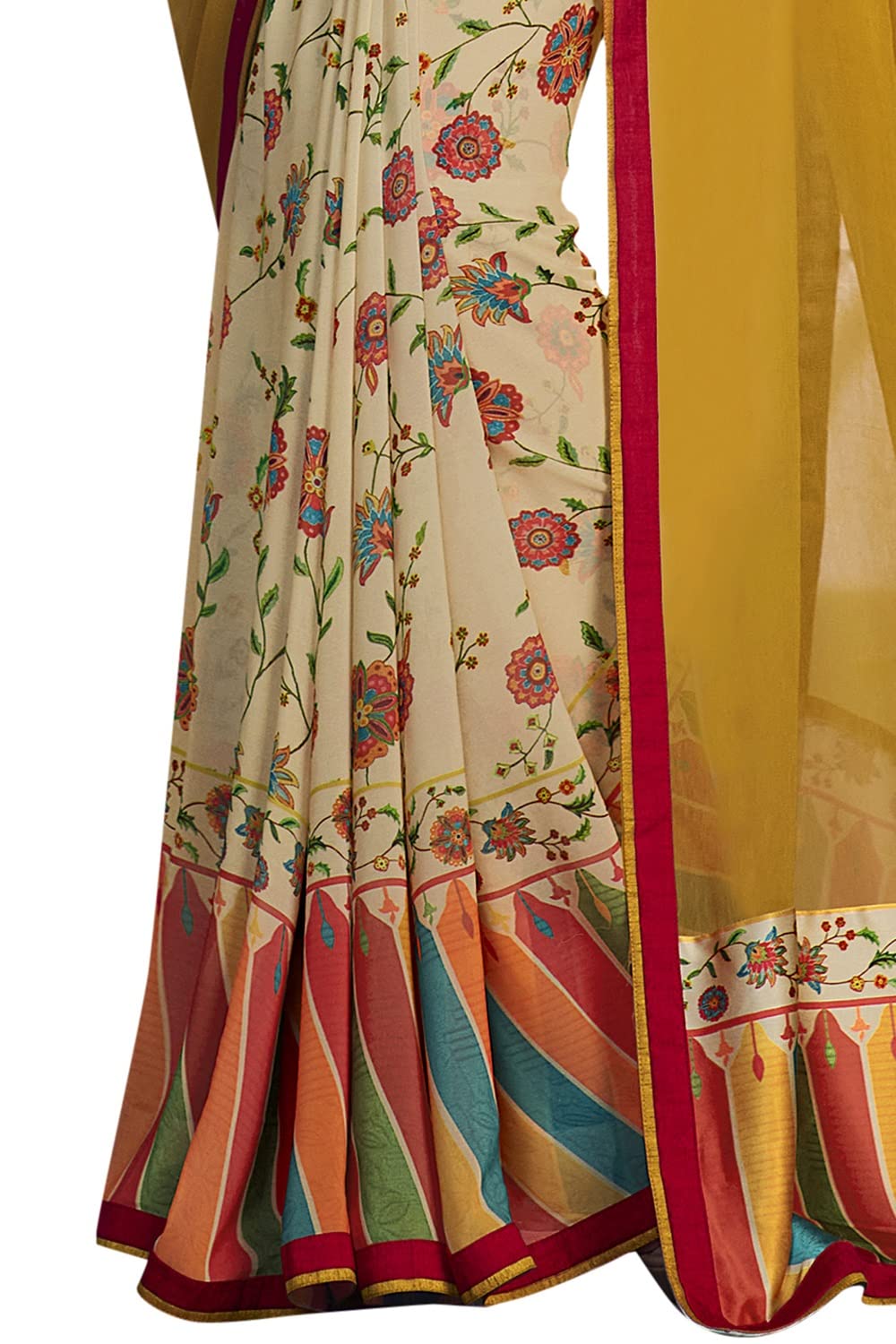 Explore the collection of beautifully designed Georgette Printed sarees from Rajeshwar Fashion on Amazon. Each piece is elegantly crafted and will surely add to your wardrobe. Pair this piece with heels or flats for a graceful look.