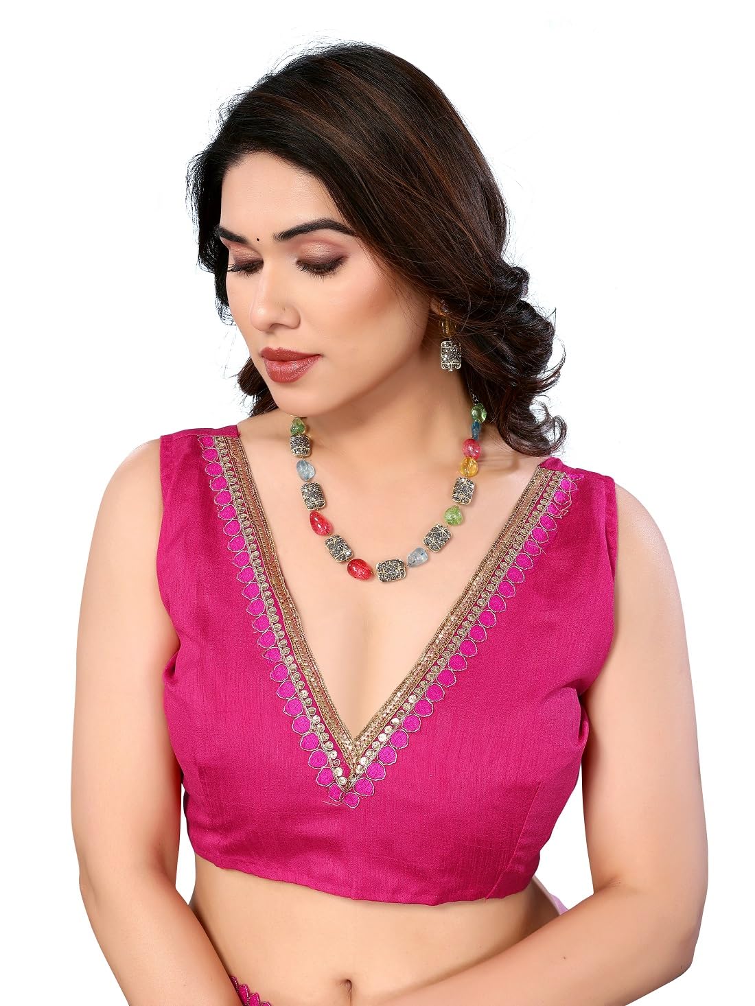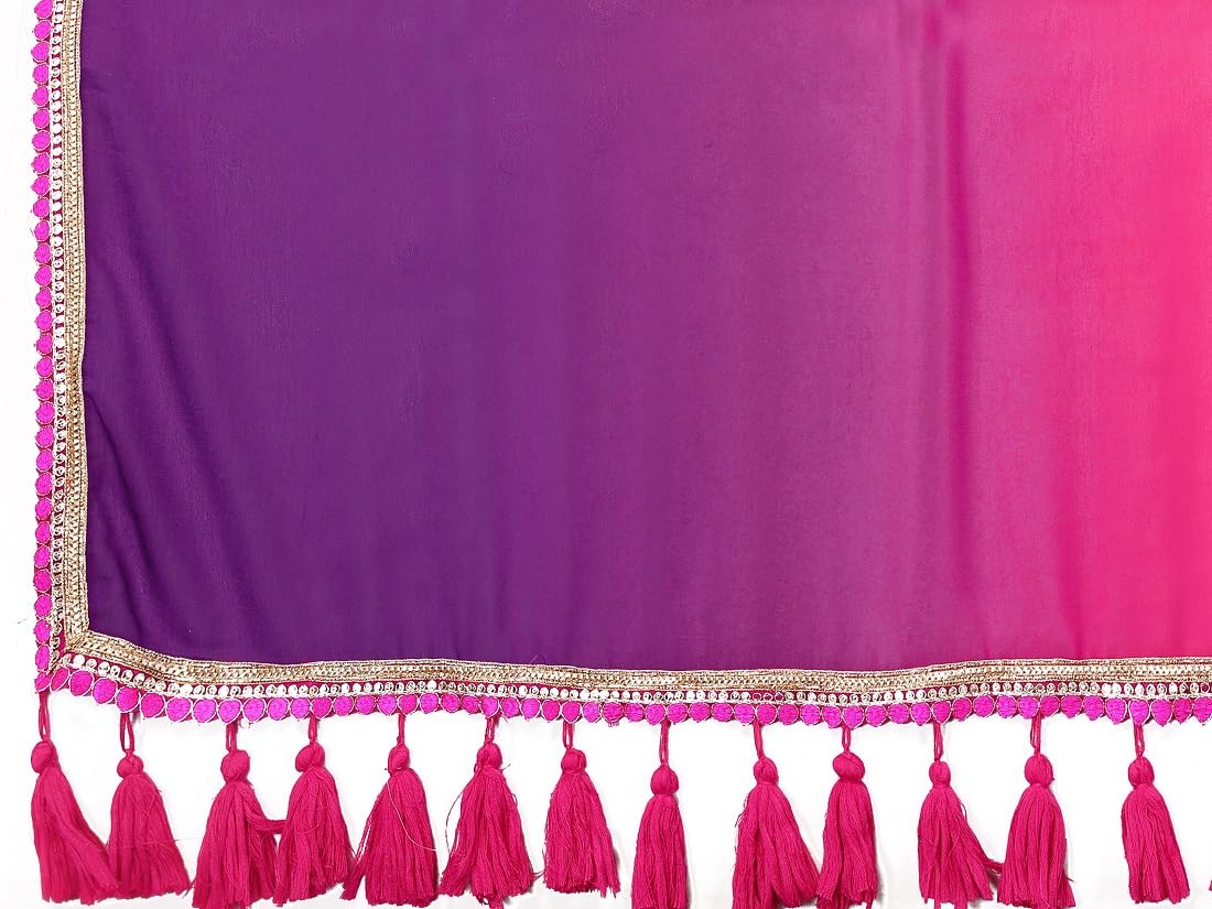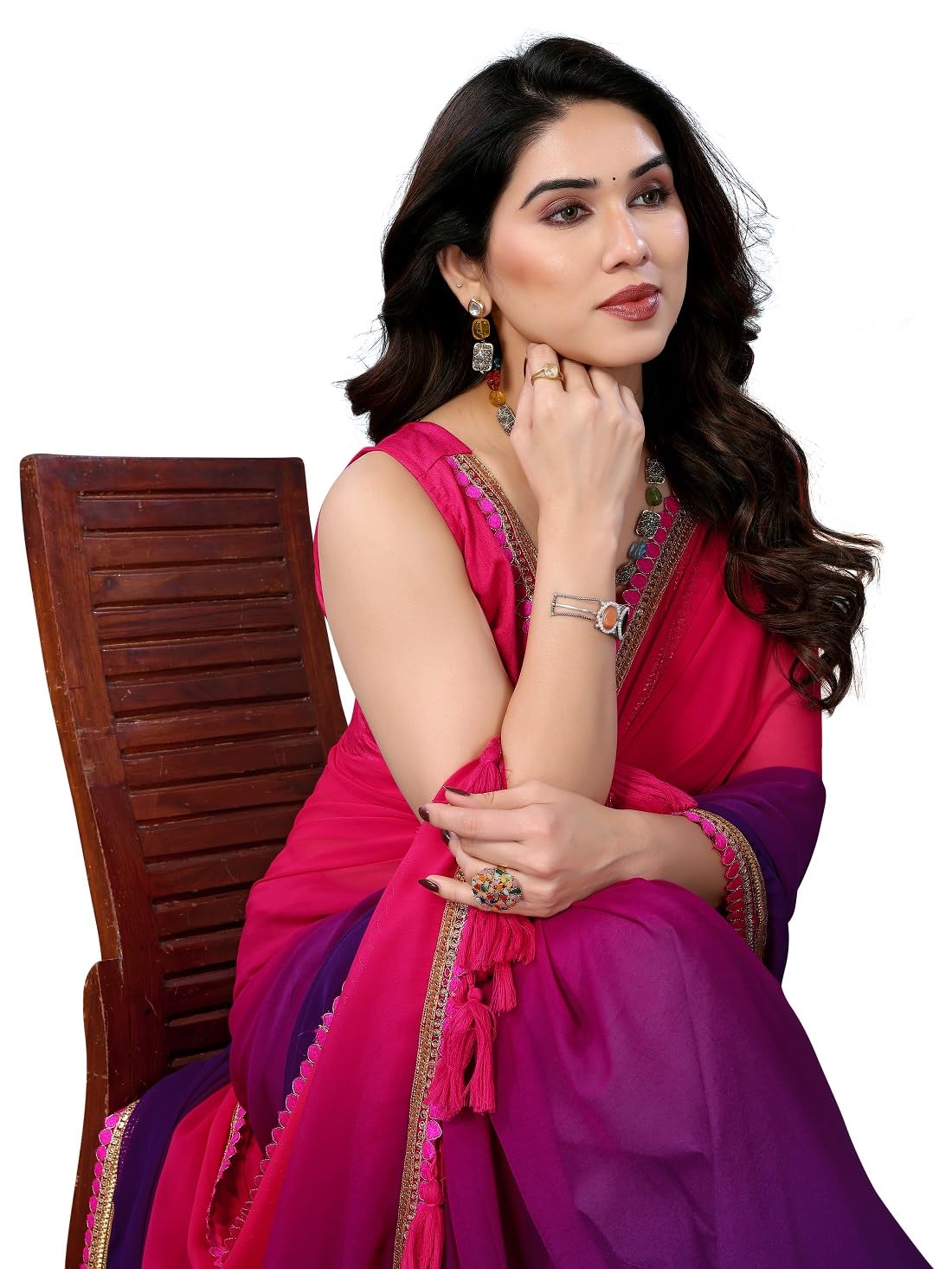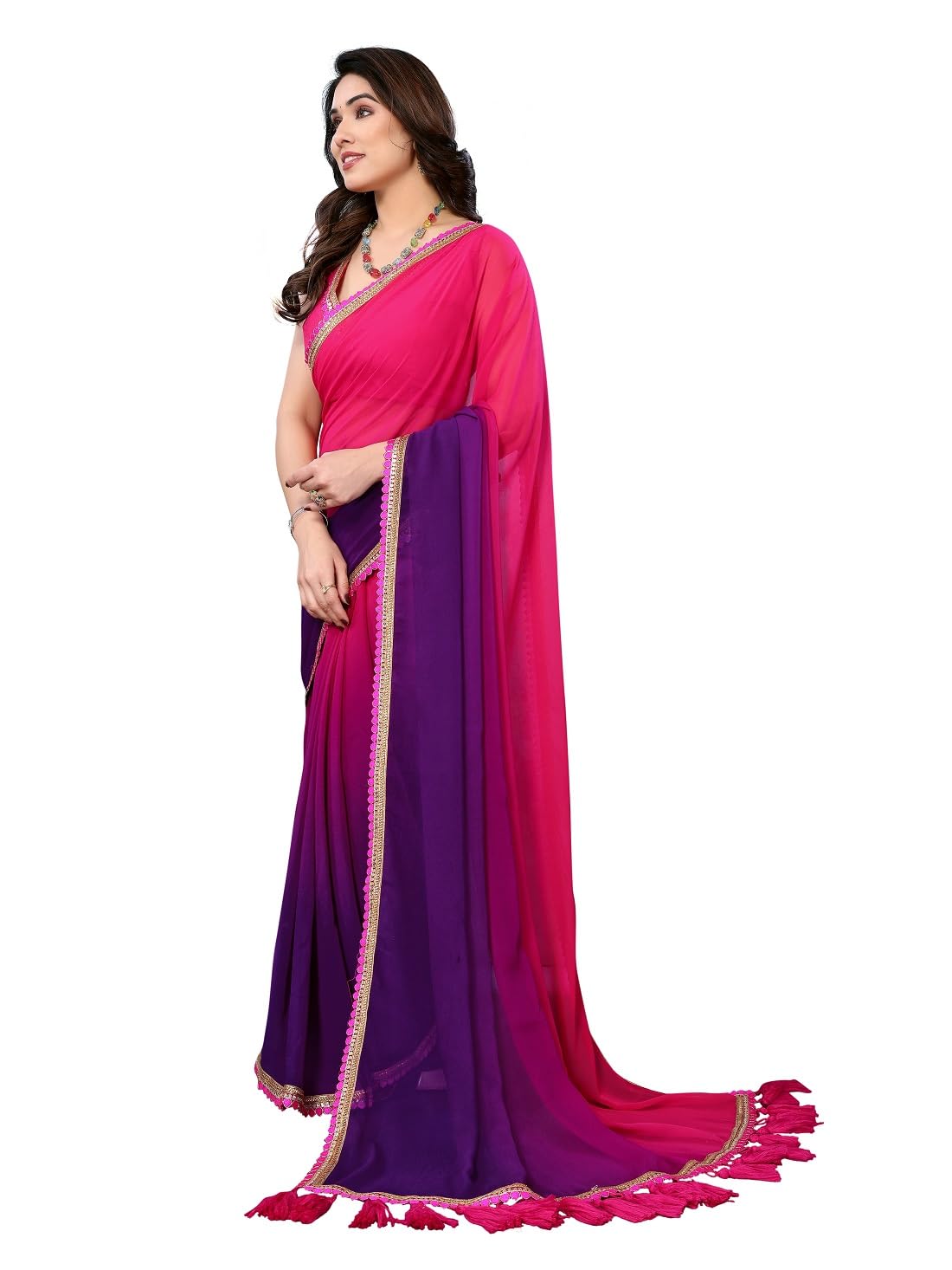 Discover the beauty of our Rajeshwar Fashion Georgette Saree, a stunning piece that combines elegance and comfort. The vibrant lime green color creates a fresh and youthful look, while the contrasting rani or magenta lace border adds a touch of sophistication. The simplicity is enhanced by the beautiful 15-20 tassels in rani or magenta color that adorn the pallu, creating a playful and eye catching detail The included unstitched blouse piece in a matching rani or magenta color allows you to customize the fit to your preference. Pair this saree with elegant jewelry and accessories to complete the ensemble. Experience the luxury of our high-quality georgette fabric. This lightweight and breathable material ensures comfort throughout the day, making it perfect for various occasions. Embrace the beauty and versatility of our Rajeshwar Fashion Lime Green Georgette Saree. This exquisite piece is a must have for any woman who appreciates timeless style and exceptional craftsmanship. 4. Product Specifications: Brand: Rajeshwar Fashion Fabric: Georgette (Saree Lace, Rani/Magenta (Border and Tassels) Design: Plain Saree with Lace Border and Tassels Saree Length: 5.5 meters Blouse Piece: Unstitched, 80cm (Rani/Magenta) Occasion: Casual, Semi-Formal