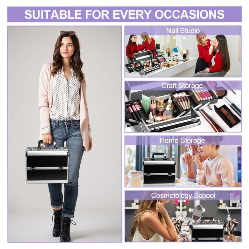 Secure and Portable Design: Equipped with a lockable handle, this makeup case ensures that your items stay secure during transport. The handle’s ergonomic design provides comfortable carrying, making it an ideal choice for on-the-go use, whether for travel or daily activities.