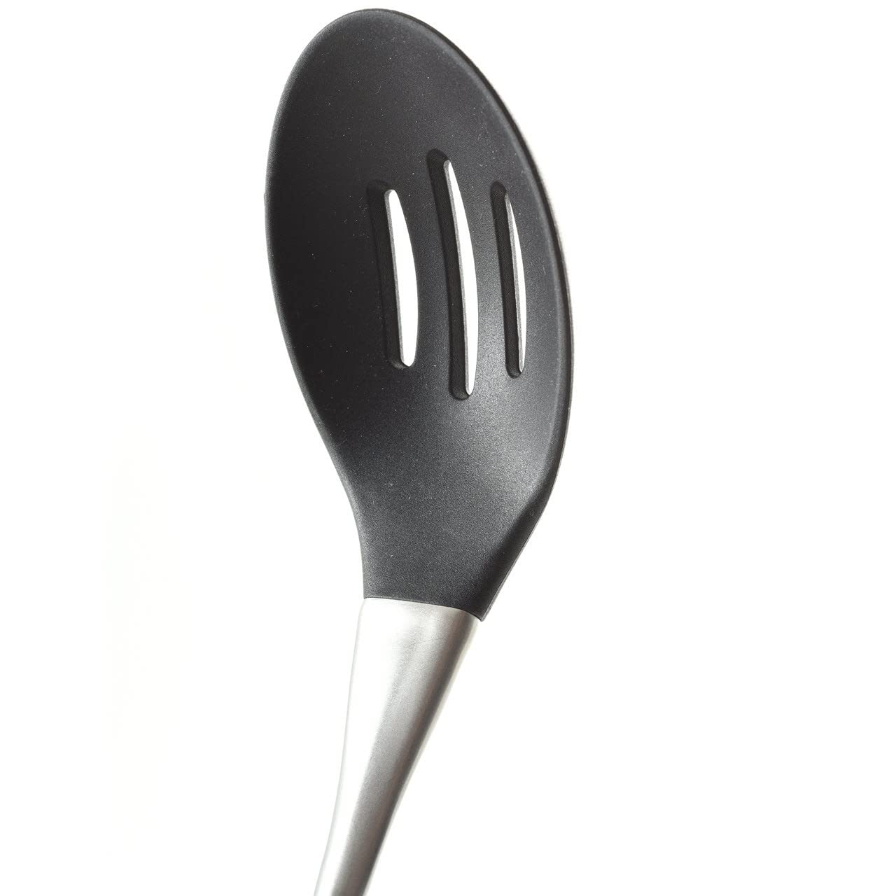 Our Slotted Serving Spoon is made of resilient food-grade nylon and polished stainless steel. The angled handle gives this lightweight kitchen accessory balance, and the smooth ergonomic grip gives you optimal control when draining meat, stirring stews and serving side dishes. With its dep bowl you can use it to gently lower eggs into boiling water without breaking them. The stain-resistant property of the nylon would even withstand lowering the eggs into food dye for festive holiday occasions. When done, simply add the Slotted Serving Spoon to your dishwasher. It will return to pristine condition.