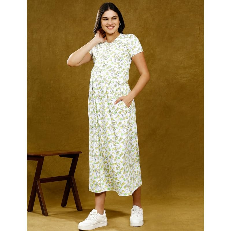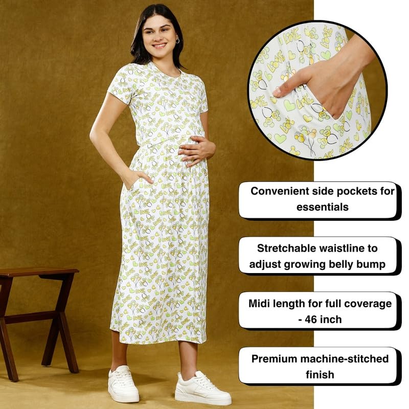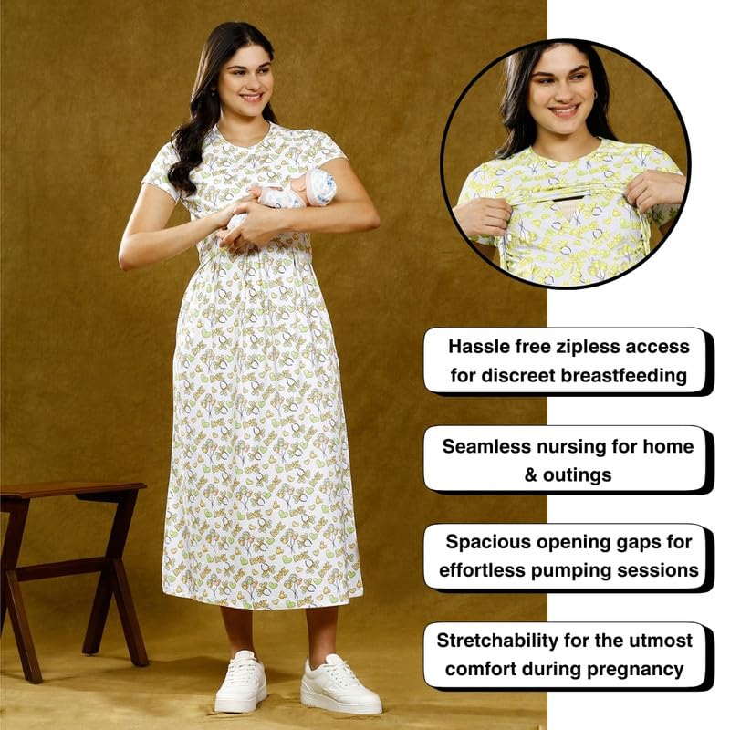Experience unmatched comfort and style with our zipless maternity dress, crafted from breathable and stretchable knitted polyester fabric. Designed for moms, it offers effortless feeding access without zippers, ensuring convenience and privacy. Featuring side pockets for your essentials, a tie-up belt for a custom fit, and extra space to accommodate your growing baby bump, this versatile maternity gown is perfect for every stage of motherhood. Whether for daily wear, festive occasions, or baby showers, this elegant piece adds charm to your wardrobe. Available in vibrant colors, it’s a thoughtful gift for moms-to-be or postpartum essentials.