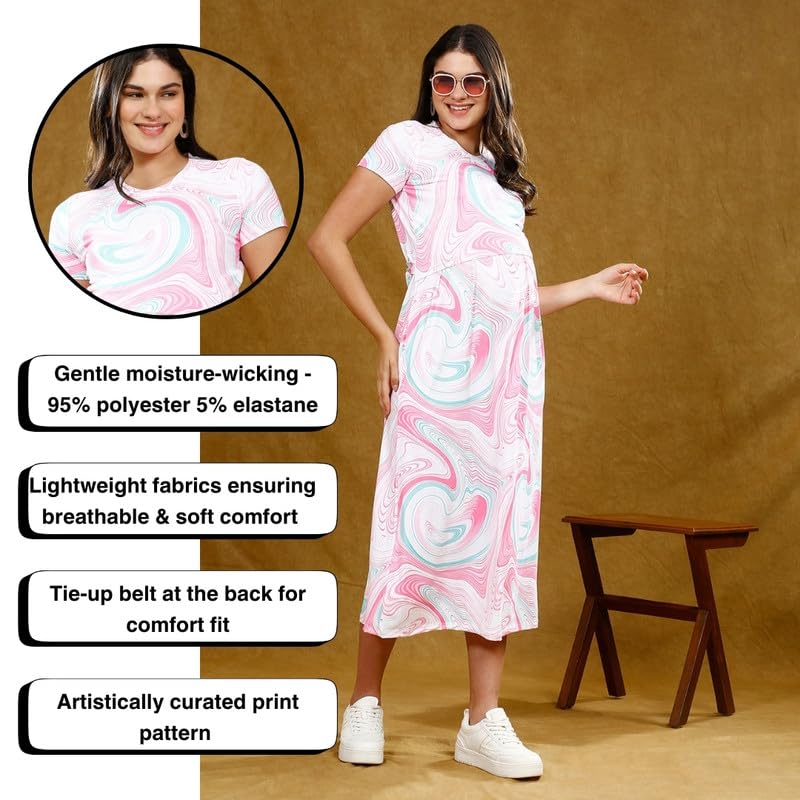 Experience unmatched comfort and style with our zipless maternity dress, crafted from breathable and stretchable knitted polyester fabric. Designed for moms, it offers effortless feeding access without zippers, ensuring convenience and privacy. Featuring side pockets for your essentials, a tie-up belt for a custom fit, and extra space to accommodate your growing baby bump, this versatile maternity gown is perfect for every stage of motherhood. Whether for daily wear, festive occasions, or baby showers, this elegant piece adds charm to your wardrobe. Available in vibrant colors, it’s a thoughtful gift for moms-to-be or postpartum essentials.