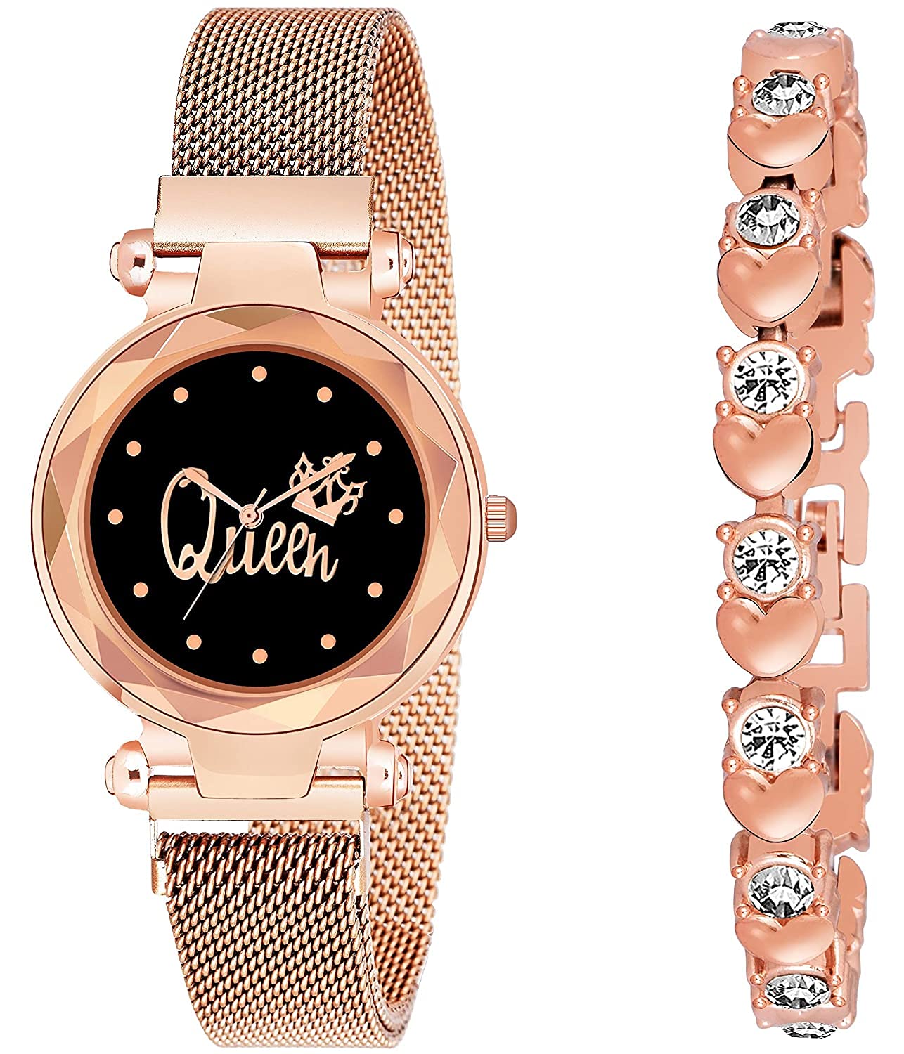 Watch Analogue Queen Black Dial Magnet Watch with Gift Heart Shape Bracelet for Women or Girls and Watch for Girl or Women (Combo of 4)