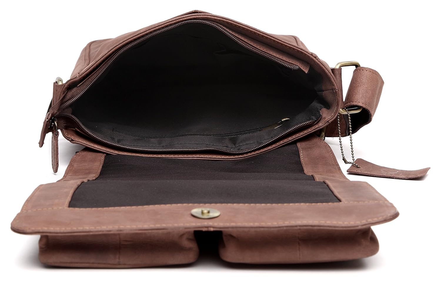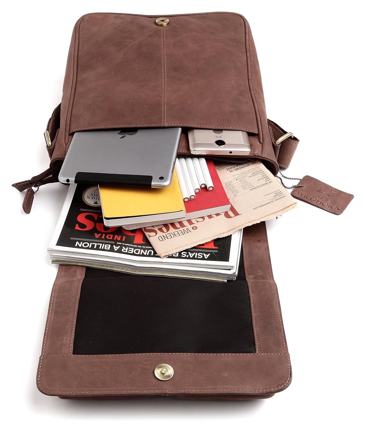 WildHorn Leather Products are created using the finest materials; every product is manufactured taking great care of the quality and creating designs that will meet your needs today and into the future. This messenger bag has a vintage inspired look that makes it perfect for everyday travel. The WildHorn Casual Style Cowhide Genuine Leather Messenger Bag features durable rich leather flap top, leather trim and an adjustable shoulder strap that can be slung comfortably across the body.This messenger bag has a main medium sized compartment with a flap top closure for added security, and a fully lined interior that includes zipper pockets and slip pockets for organization. A rear zipper pocket offers added storage for small accessories. One main interior compartment and one slip compartment.The compartments has a dedicated space for I pad, tablet, phone & other small accessories three zip pockets and three slip pockets.
