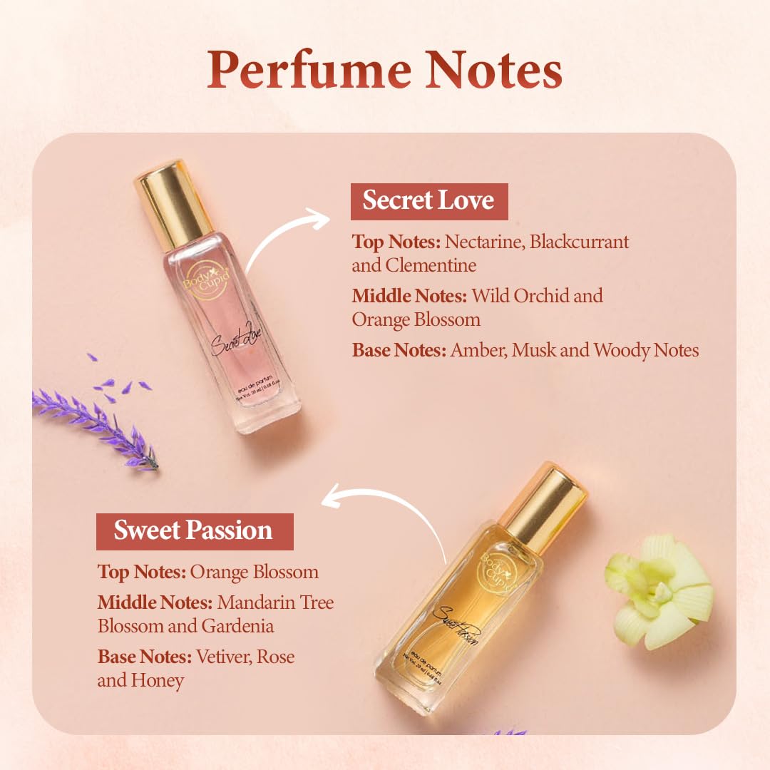 GIFT SET FOR WOMEN: Make a gift of enchanting scents with Body Cupid Perfume Set for Women. This specially curated fragrance set contains four of the bestseller perfumes from Body Cupid. This perfume combo is the ultimate in subtle allure and refined elegance. EASY TO CARRY, LONG LASTING PERFUMES: The fragrances in the Body Cupid Perfume Set for Women come in travel size which one can carry along anywhere. These bestselling perfumes contain higher concentration of fragrance oil and give a more intense fragrance pay off. The EDP lasts up to 10 hours. So, a few spritzes is enough to keep you fresh almost through the day. SWEET PASSION EAU DE PARFUM: A romantic perfume that embodies captivating sensuality and charm. It has an effervescent, floral scent where zesty citrus notes are nuanced with lush, intoxicating white florals and sweet, smoky, earthy accord. SECRET LOVE EAU DE PARFUM: A tantalizing scent that envelops you in a seductive aura. It is a sweet, sensual perfume that unfolds with intense fruity notes blending into delicate floral notes that finally mellows down to earthy, amber accord. SEDUCTIVE EAU DE PARFUM: A truly alluring perfume that creates an enchanting appeal. It has exotic oriental fragrance that opens with sweet, fruity aroma slowly gliding into intense white floral notes, finally settling into warm honey and amber notes. AQUA WAVE EAU DE PARFUM: A lush fragrance that is perfect for an exuberant nature. It is a fresh, aromatic perfume that plays on cool, green nuances blending into floral notes trailing into smooth woody and powdery amber accord.