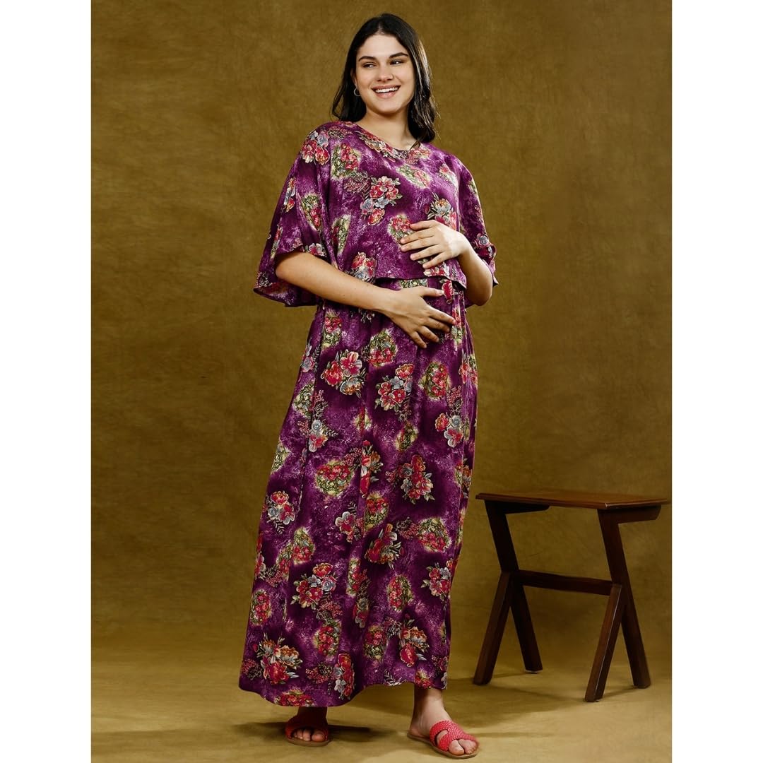 Enhance your maternity wardrobe with Dummy Shape’s elegant poncho maxi gown, designed to offer style and practicality for moms-to-be. Made from soft, breathable premium cotton rayon fabric, this gown features an attached cape for privacy during nursing or pumping sessions. Dual concealed anti-allergic zippers with inner shields ensure safe and effortless breastfeeding access. The extra belly space and maxi design provide a perfect fit, accommodating your growing bump with grace. Ideal for festive occasions, baby showers, casual outings, or nighttime comfort, this trendy nightwear is a versatile choice for mothers and beyond. Flaunt your motherhood journey with this modern yet traditional piece.