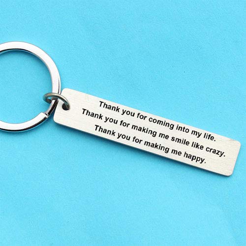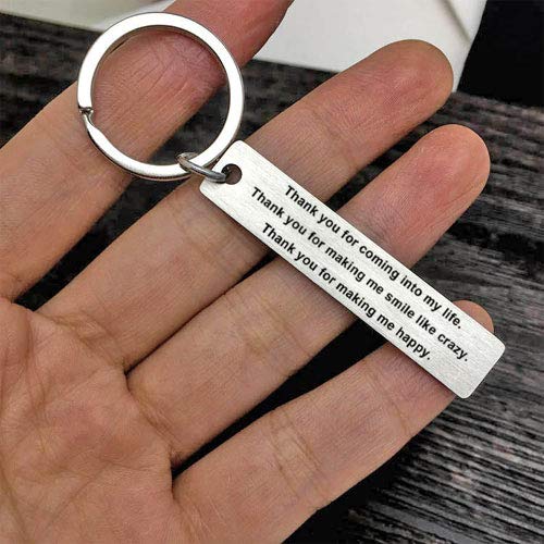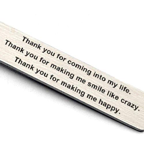 This metallic keychain carries a romantic message for your loved one that they can carry with them always. The high-quality product is engraved with the caption – Thank you for coming into my life. Thank you for making me smile like crazy. Thank you for making me happy.