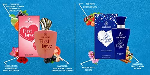 By The Perfumer : First Love the fragrance that seduces secretively, like a secret love potion. The top note describes Grapefruit, Blue berry, Green Apple, Blackcurrant and Cassia. Heart note with Rose, Water Lily and Grapefruit. The composition ends with Blackberry, Musk, Sandalwood and Tomato. My Sweet love The scent of love. A sparkling opening bursts with Citrus Fruit with a mouth watering note of Berries. The heart note unveils a bouquet of Fresh Floral Flowers and a seductive closing note of Fruity, Wed Woods and Musks.