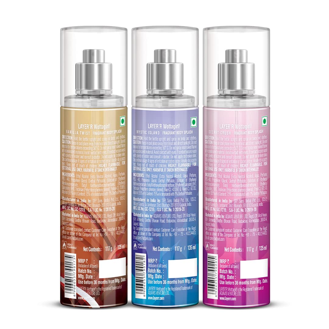 PACKAGE CONTAIN-Wottagirl Body Splash pack of 3 (Vanilla Twist 135ml + Mystic Island 135ml + Secret Crush 135ml)