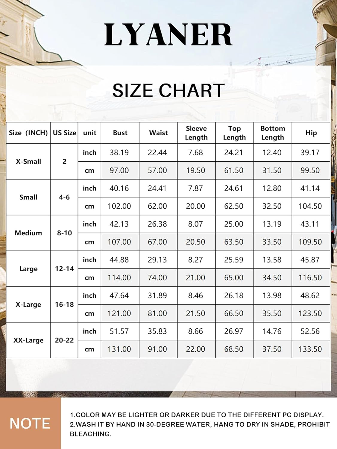 Small: Top Length: 62 cm/24.5″, Shoulder: 40 cm/15.75″, Bust: 100 cm/39.25″, Sleeve Length: 19 cm/7.5″, Waist: 62 cm/24.5″-102 cm/40.25″, Hip: 104 cm/41″, Shorts Length: 29 cm/11.5″,
