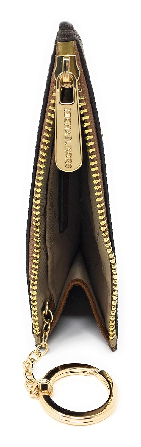 Michael Kors Jet Set Travel Small Top Zip Coin Pouch with ID Holder is crafted in monogram printed PVC coated twill and finished with polished hardware. The top zip compartment offers a card slip and a tethered split key ring. The back offers (3) additional slips and a clear ID holder. It’s just the right size when you’re on the go, or to toss into a larger bag. It measures approximately 5 inches (L) x 3 3/8 inches (H).