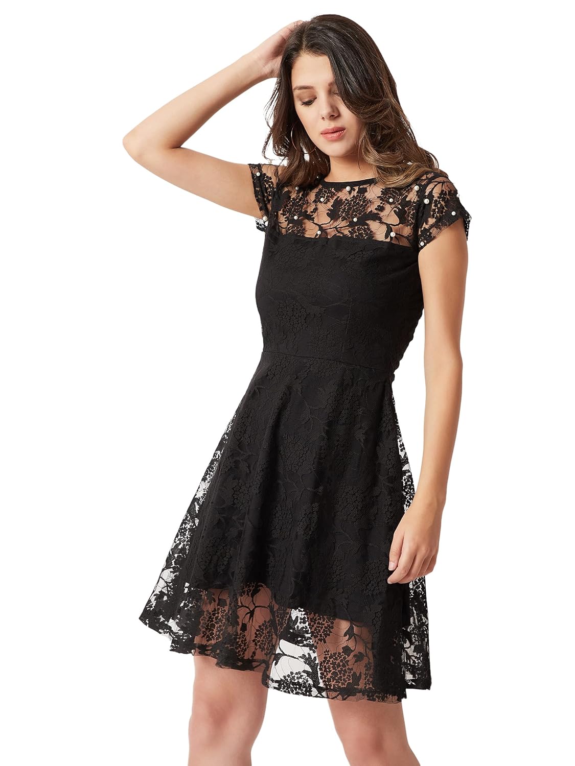 Generic Name : Miss Chase Women’s Designer Black Round Neck Cap Sleeves Lace Solid Embellished Mini Skater Dress with Zip Closure(MCAW18D10-94-62-04, Black, Medium)