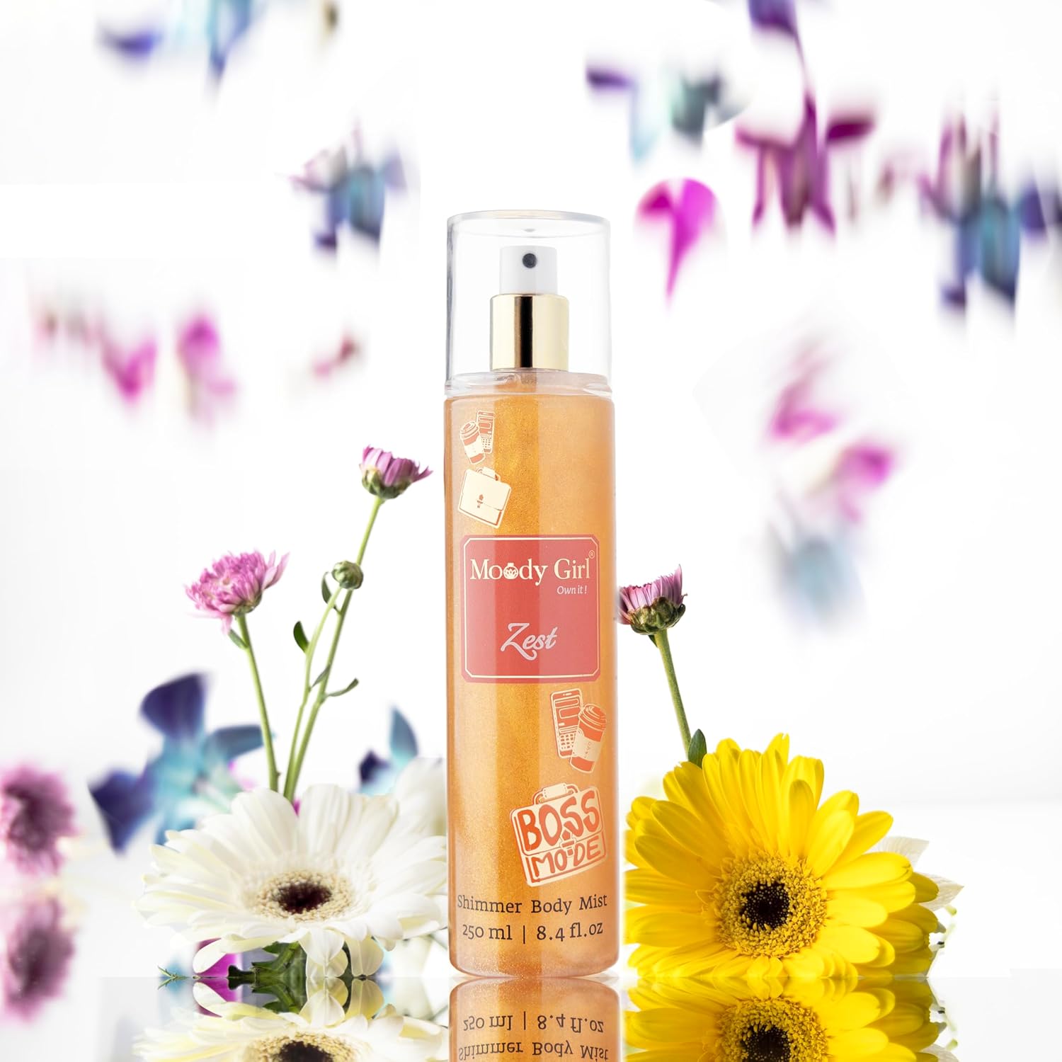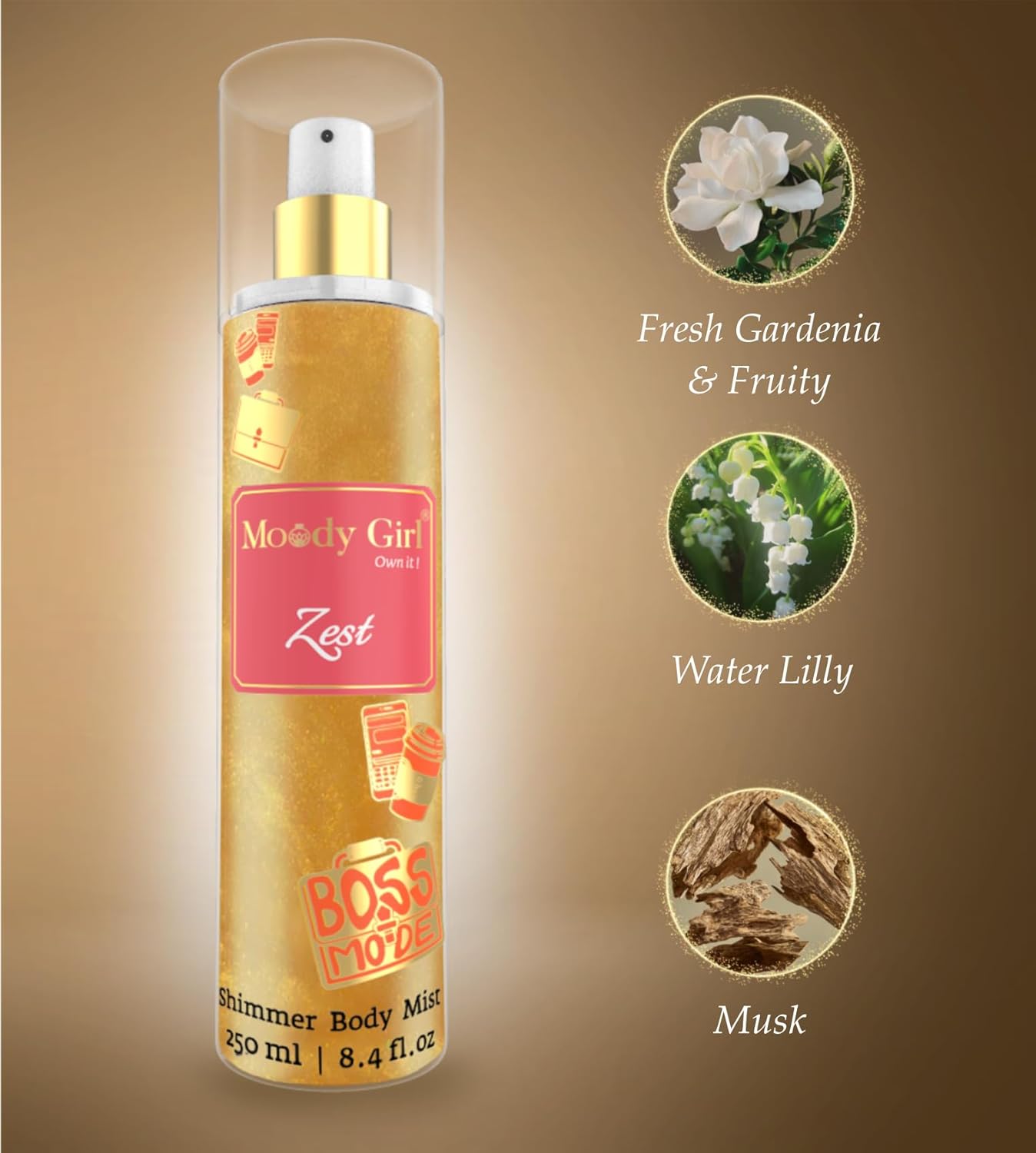 Zest Shimmer Body Mist blends the freshness of gardenia with warm, musky-woody notes to create the perfect concoction of smells that lift your spirits. This perfume is the ideal companion for the boss lady in you. Illuminate your skin and senses with our Shimmer Body Mist, where elegance meets radiance. Infused with a delicate blend of shimmering micro-particles, this mist not only refreshes but leaves your skin with a luminous, sun-kissed glow. Crafted with nourishing ingredients, our formula hydrates and envelops you in a light, enchanting fragrance that lingers subtly throughout the day. Perfect for special occasions or adding a touch of sparkle to your everyday routine, this body mist ensures you always shine with confidence. Get your daily mood fix with Zest.