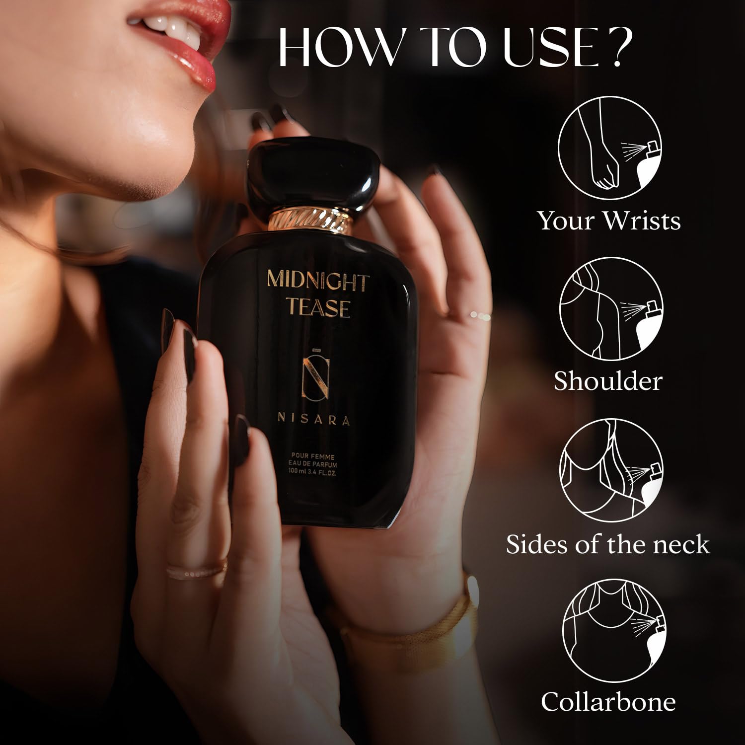 How To Use? Hold the bottle upright 15-25 cm away from your body. Spray directly on the pulse points, such as your wrists, neck, and behind your ears. For a long-lasting fragrance, avoid rubbing the perfume.