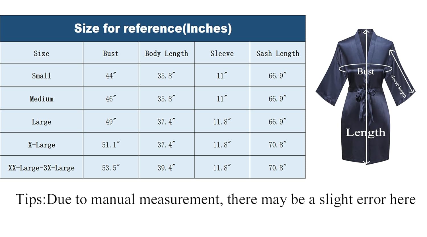 2XL/3XL: Bust—53.5″; Body Length—39.4″; Sleeves( from neckline to bottom of sleeve)—11.8″; Sash Length—70.8″.