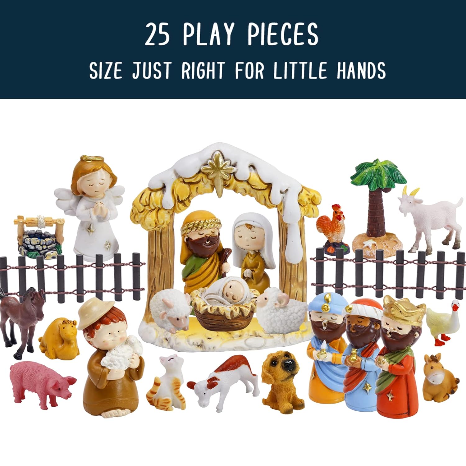 25 SURPRISES TO DISCOVER – Fully loaded with farm animals, camels, shepherds, wise men, an angel, trees, and most importantly the Christ child in his manger and his mother Mary and father Joseph.