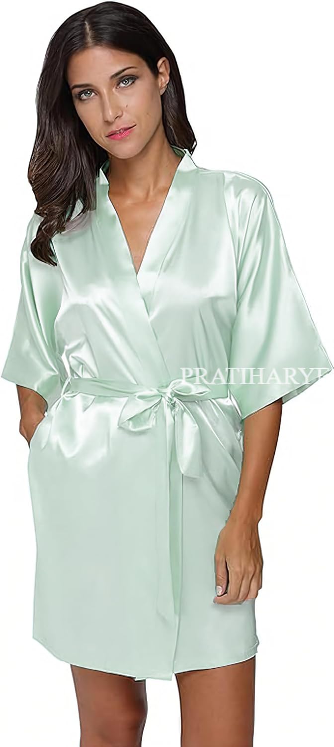 Color: Pista , Print: Bridemaids , Style: Elegant , Details: Knot, Wrap , Pattern Type: Plain , Neckline: V neck , Sleeve Length: Three Quarter Length, Sleeve Sleeve Type: Drop Shoulder , Length: Knee Length , Fit Type: Loose , Type: Satin Robe , Fabric: Non-Stretch , Number of Pieces: 2 Piece Set (refer 5th point what comes in pack)