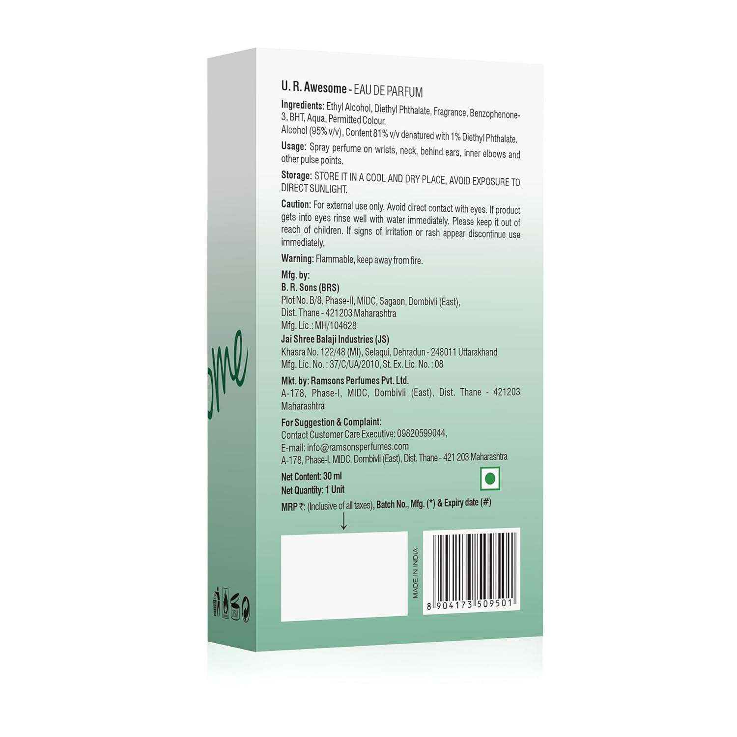 U. R. Awesome Is An Attractive Combination Of Musk, Guaiac Wood, And Sandalwood At The Base With Essence Of Sea Grass, Ginger, Jasmine, Rose, Geranium, And Cyclamen In The Heart That Exudes An Enticing Fragrance. This Supremely Exotic Aroma Will Remind You Of A Scenic Beach And Caress You With Its Heart Touching Sweet Smell. A Pinch Of Aquatic, Lavender, Mint, Bergamot, And Lemon Makes U. R. Awesome An Enduring Perfume