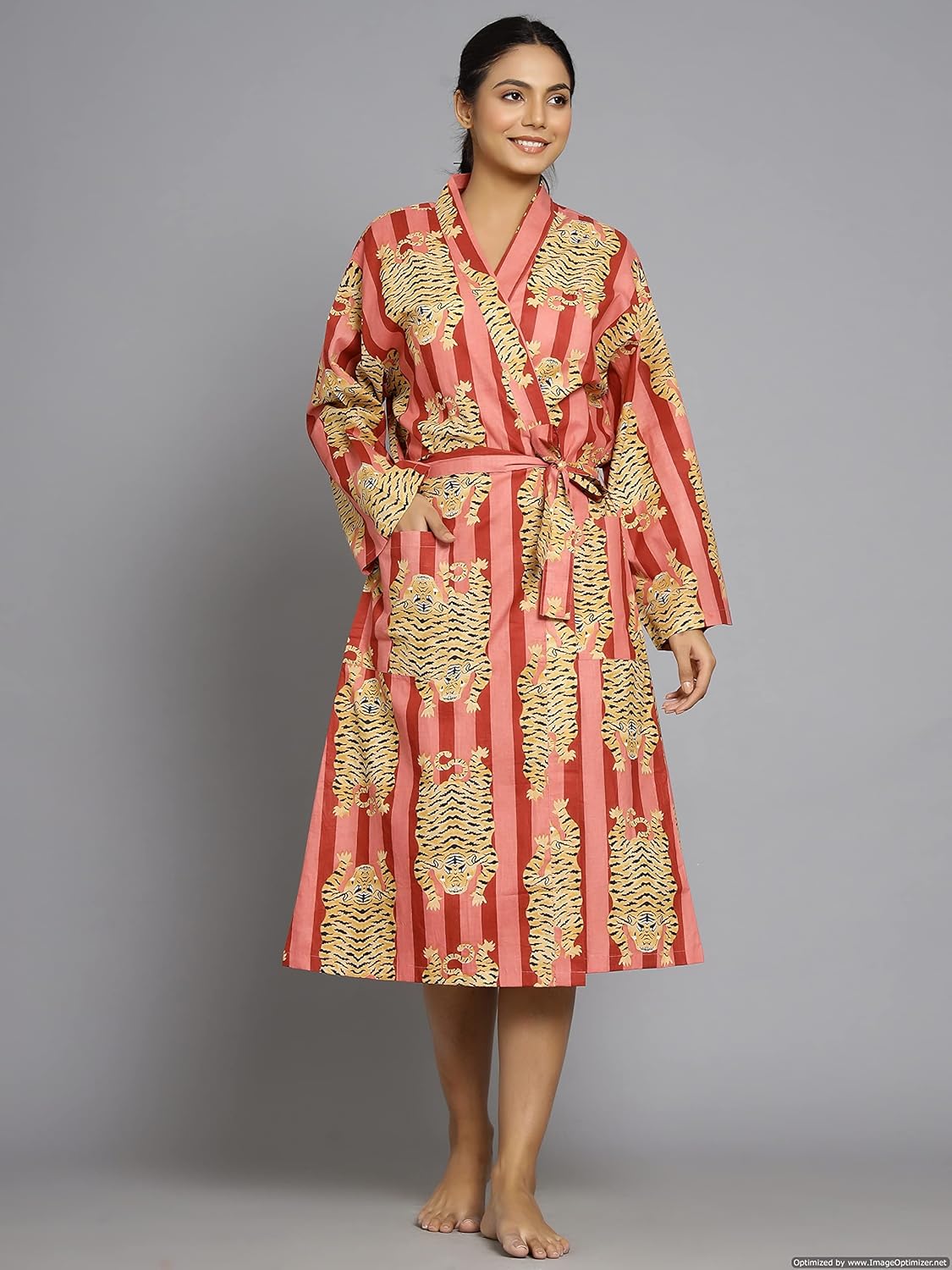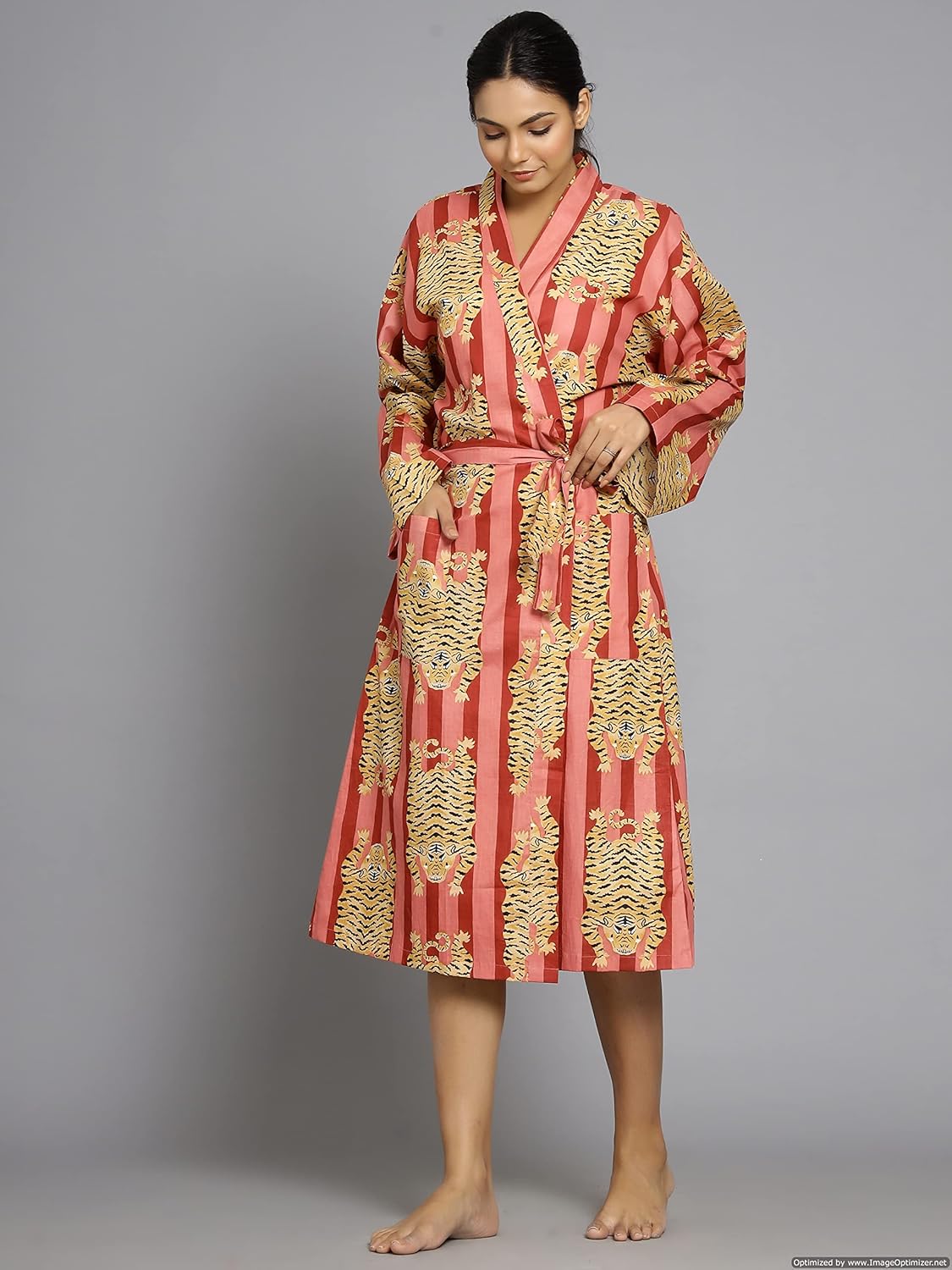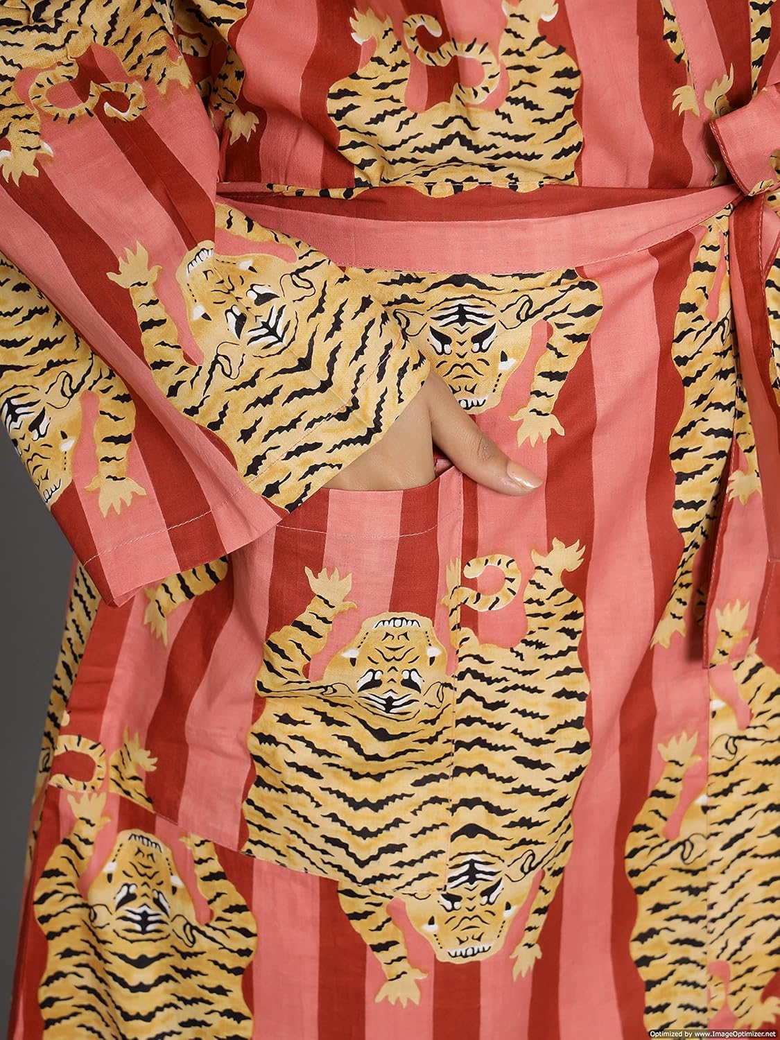 Tiger Print: Striking and chic tiger pattern that makes a bold fashion statement.Kimono Style: Loose-fitting with wide sleeves and an open front for effortless elegance.Long Length: Typically falls around ankle length, offering full coverage.100% Cotton: Lightweight, breathable, and skin-friendly fabric ideal for lounging or warm weather.Soft Finish: Ensures comfort against the skin while maintaining durability.Closure: Adjustable waist tie belt for a customizable fit.Sleeves: Wide kimono sleeves for freedom of movement and an airy feel.Pockets: There are two Pockets on Front side.Versatile Wear: Can be used as a bathrobe, bikini cover-up, or casual loungewear.Free Size or Multiple Sizes: Available in standard or specific sizes (Small to 4XL) to accommodate different body types.