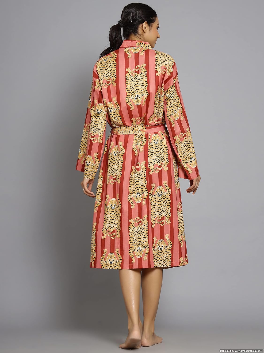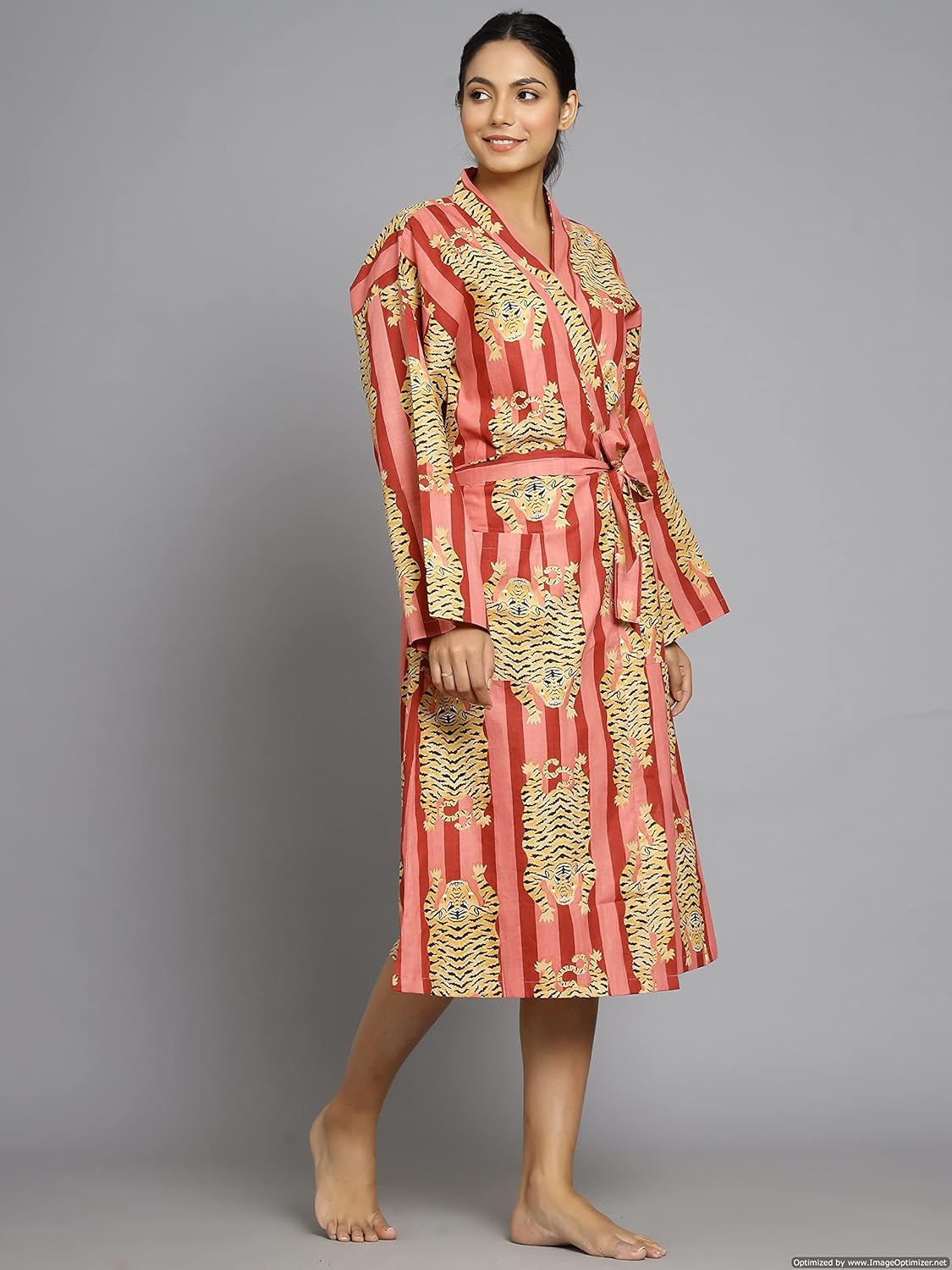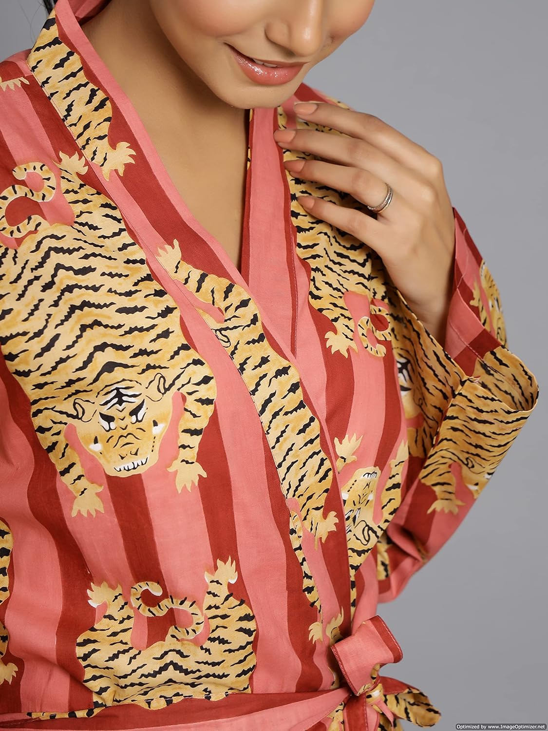 Tiger Print: Striking and chic tiger pattern that makes a bold fashion statement.Kimono Style: Loose-fitting with wide sleeves and an open front for effortless elegance.Long Length: Typically falls around ankle length, offering full coverage.100% Cotton: Lightweight, breathable, and skin-friendly fabric ideal for lounging or warm weather.Soft Finish: Ensures comfort against the skin while maintaining durability.Closure: Adjustable waist tie belt for a customizable fit.Sleeves: Wide kimono sleeves for freedom of movement and an airy feel.Pockets: There are two Pockets on Front side.Versatile Wear: Can be used as a bathrobe, bikini cover-up, or casual loungewear.Free Size or Multiple Sizes: Available in standard or specific sizes (Small to 4XL) to accommodate different body types.