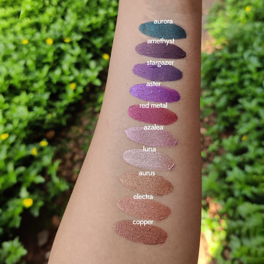 Fast Drying and Crease resistantHigh impact colour that stays all dayColours are build-able so you can be understated or bold – as you desireUncomplicated to use and super efficient especially for those who generally shy away from eyeshadows because of its impracticality and time-consuming effort.Multipurpose – can double up as a lip topper and highlighter.Acacia gum smoothens out uneven textures on skin and also has anti-inflammatory and astringent properties.