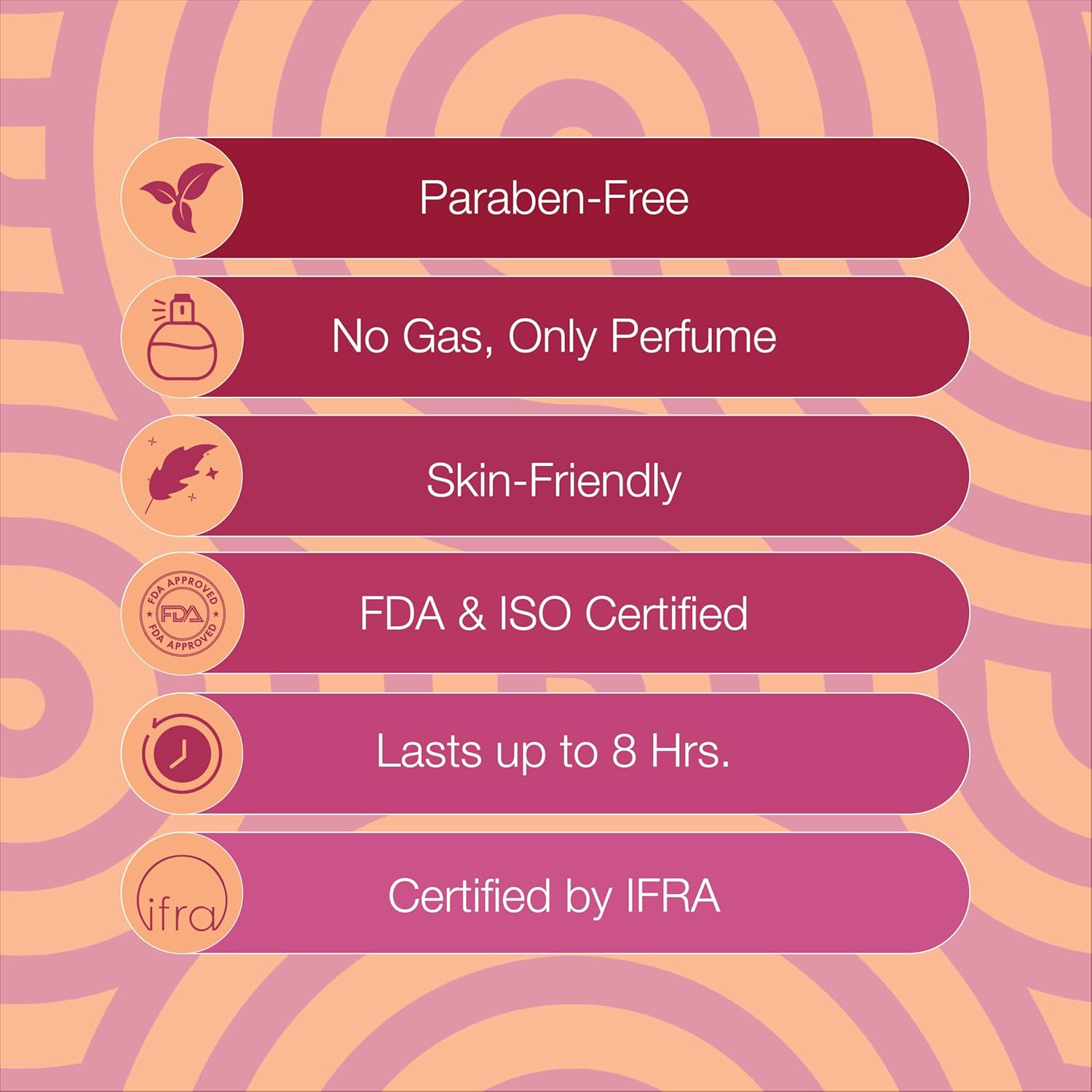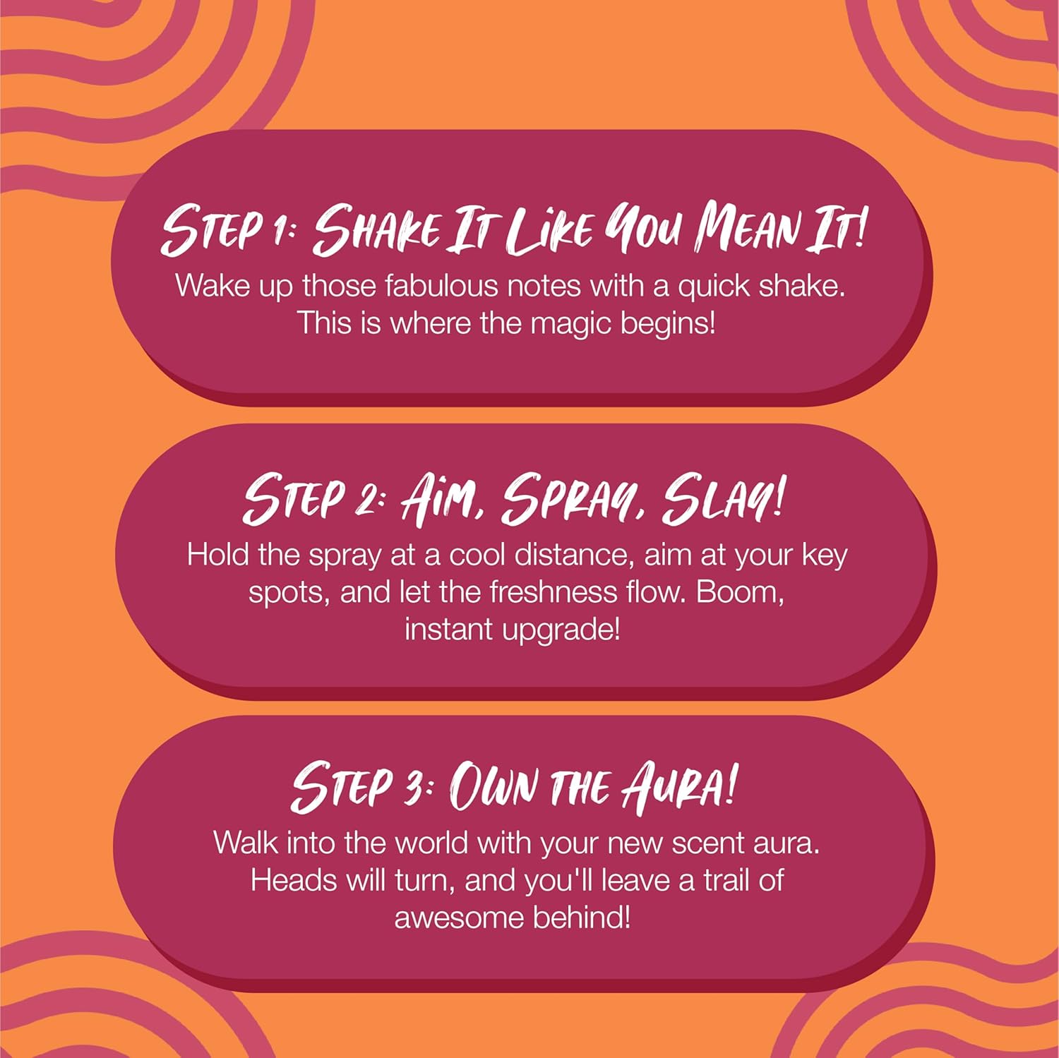 Direction to use: Keep the spray nozzle 3-6 inches away from the skin while applying. Apply on pulse points, such as inner wrists and neck. Re apply if necessary