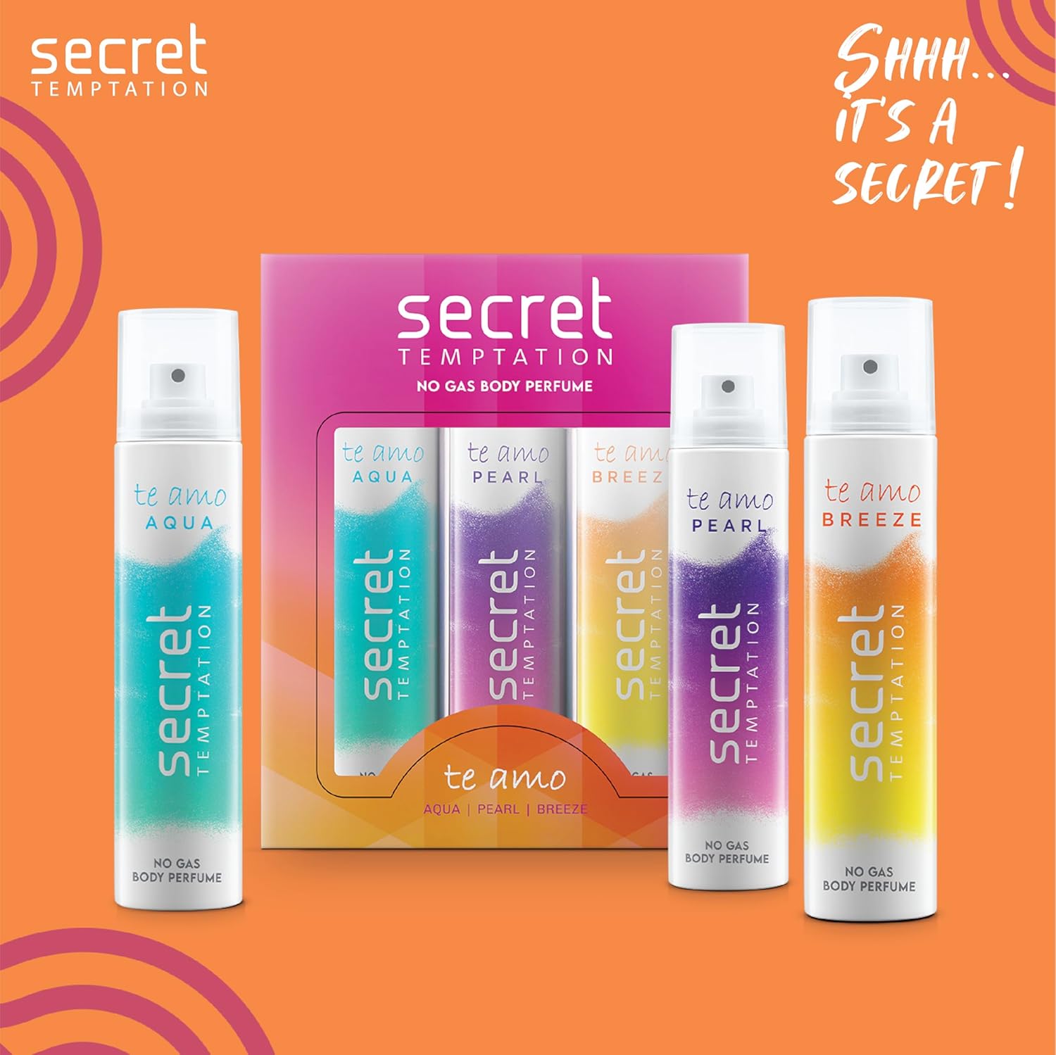 Secret Temptation Te Amo Aqua, Breeze and Pearl No Gas Deodorant Perfume Body Spray for Women, Pack of 3 (120ml each)