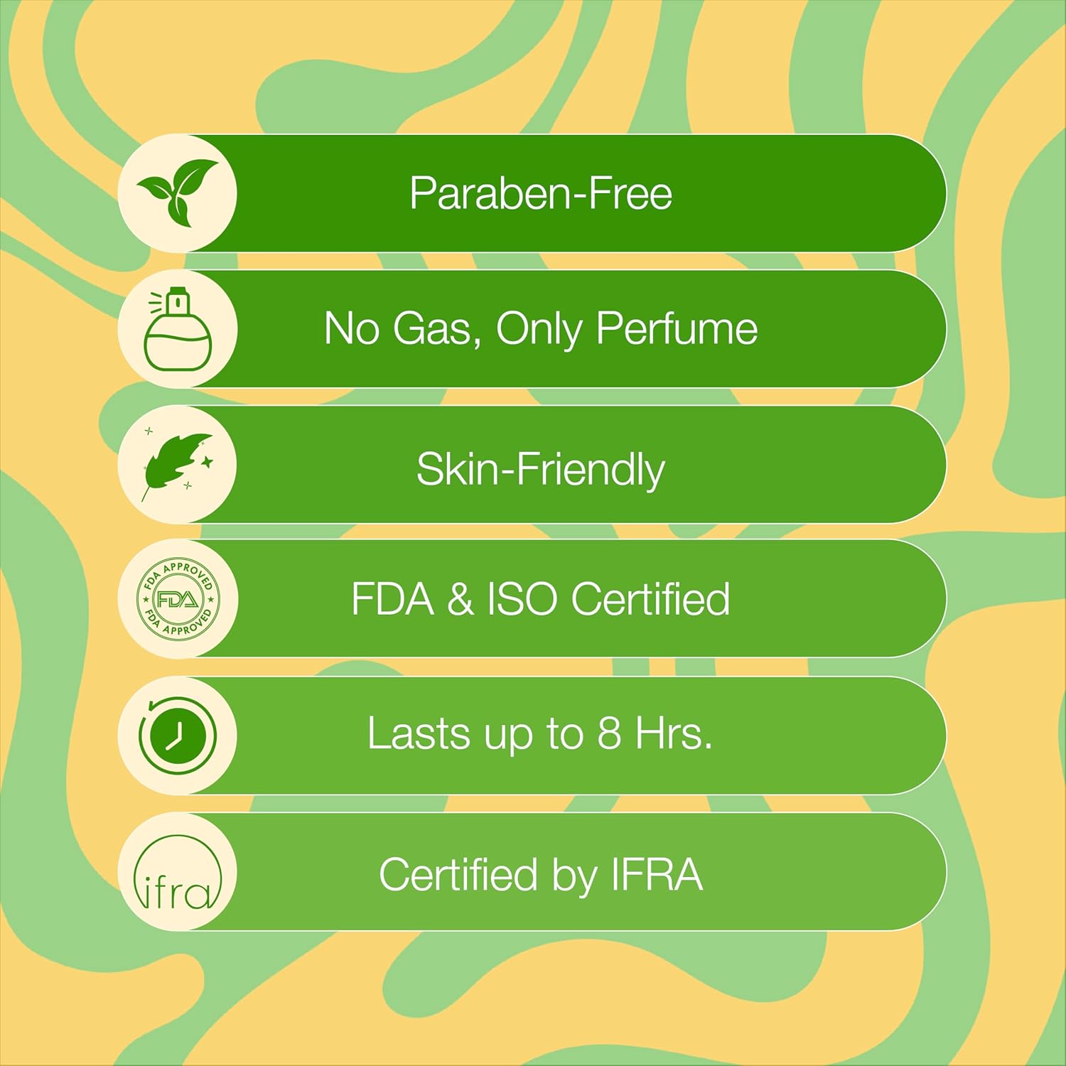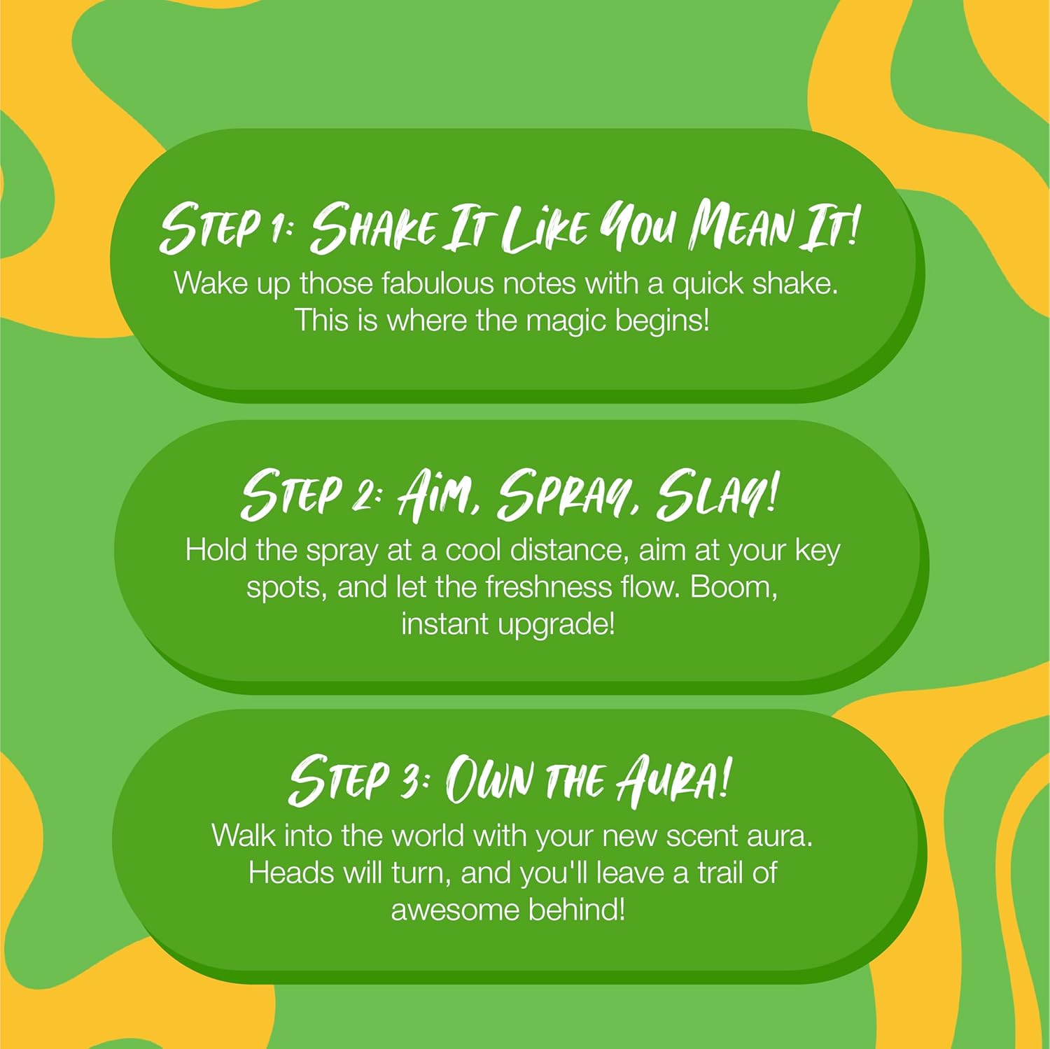 Direction to use: Keep the spray nozzle 3-6 inches away from the skin while applying. Apply on pulse points, such as inner wrists and neck. Re apply if necessary