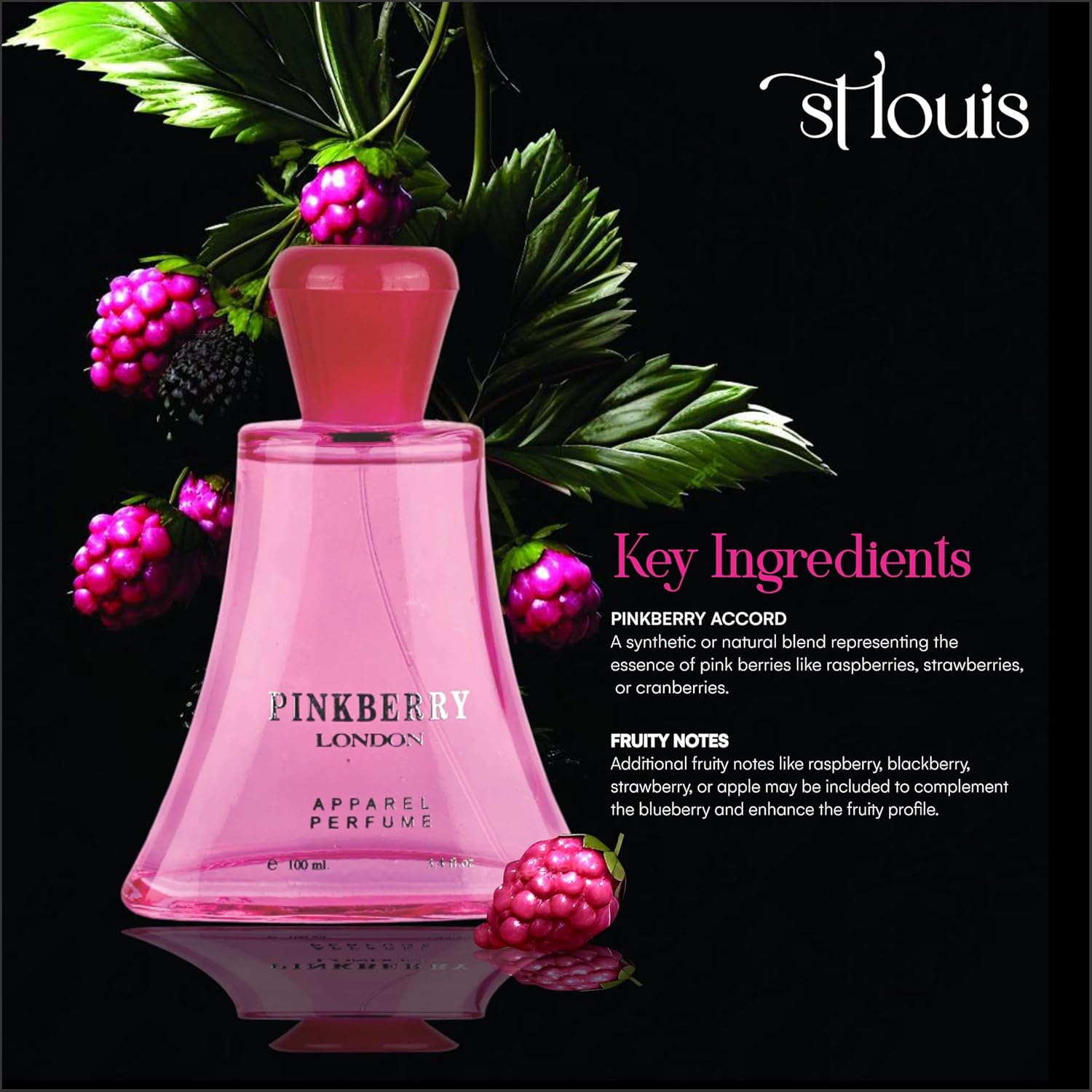 Pink Berry: Escape the ordinary and embrace a touch of British flair with St. Louis Pink Berry London Apparel Perfume. This captivating fragrance is a delightful blend of pink berries, evoking a sense of sophisticated charm.