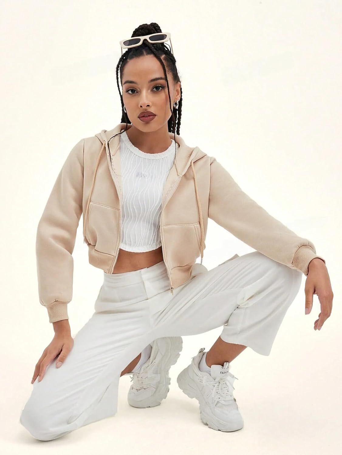 Embrace your style with this chic cropped hoodie that exudes effortless cool. The soft, plush fabric provides cosy warmth, while the zip-up design allows for easy layering. The relaxed fit and drawstring hood add a touch of casual flair, making it perfect for everyday wear. Pair it with your favourite jeans or leggings for a comfortable and trendy look. With its versatile beige hue, this hoodie seamlessly complements any outfit. Elevate your athleisure game with this fashionable yet practical piece.