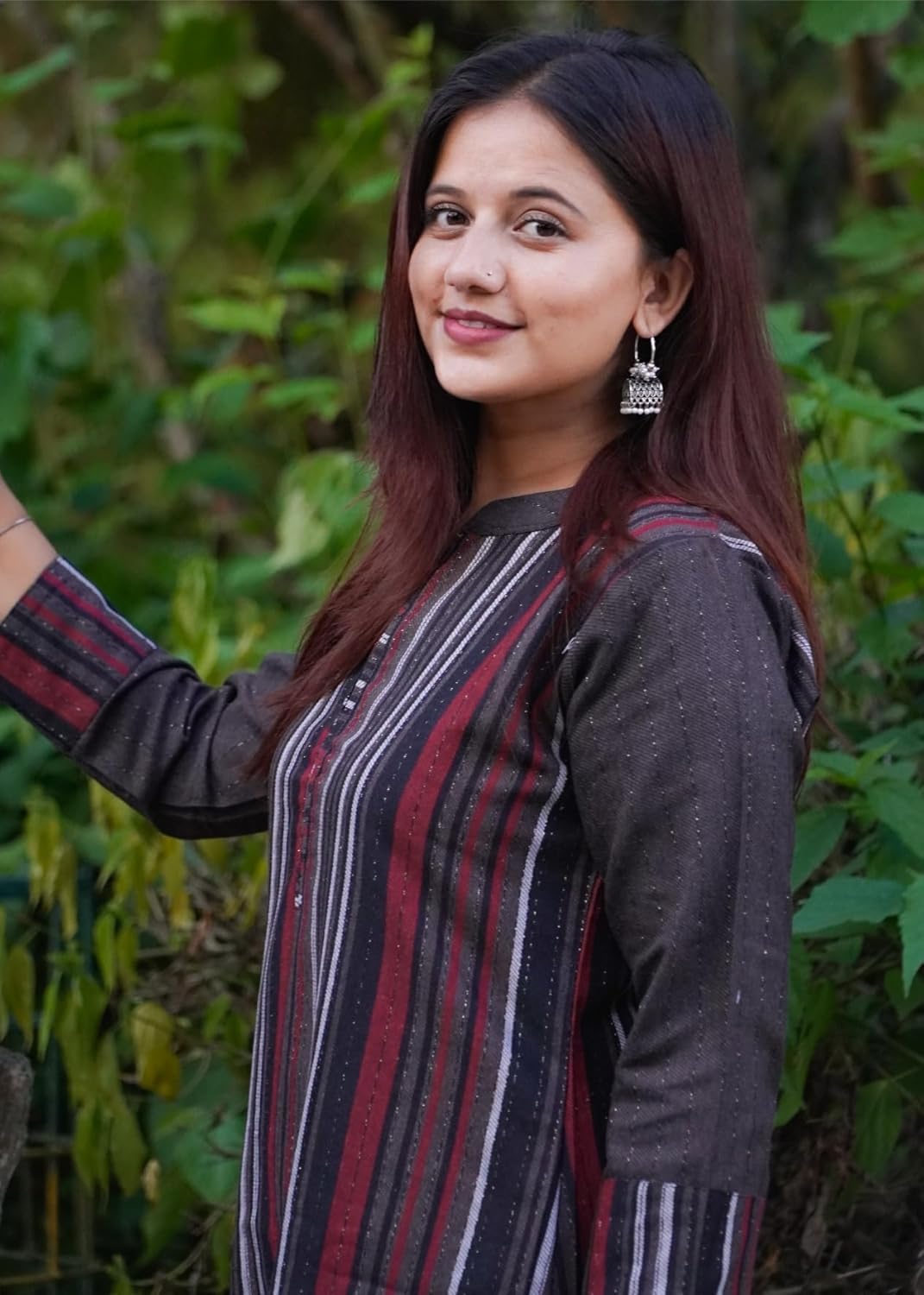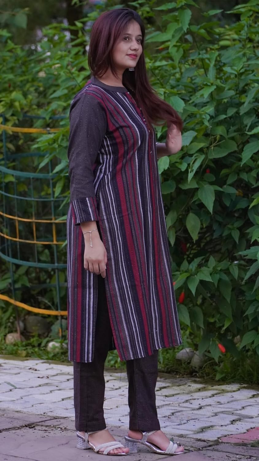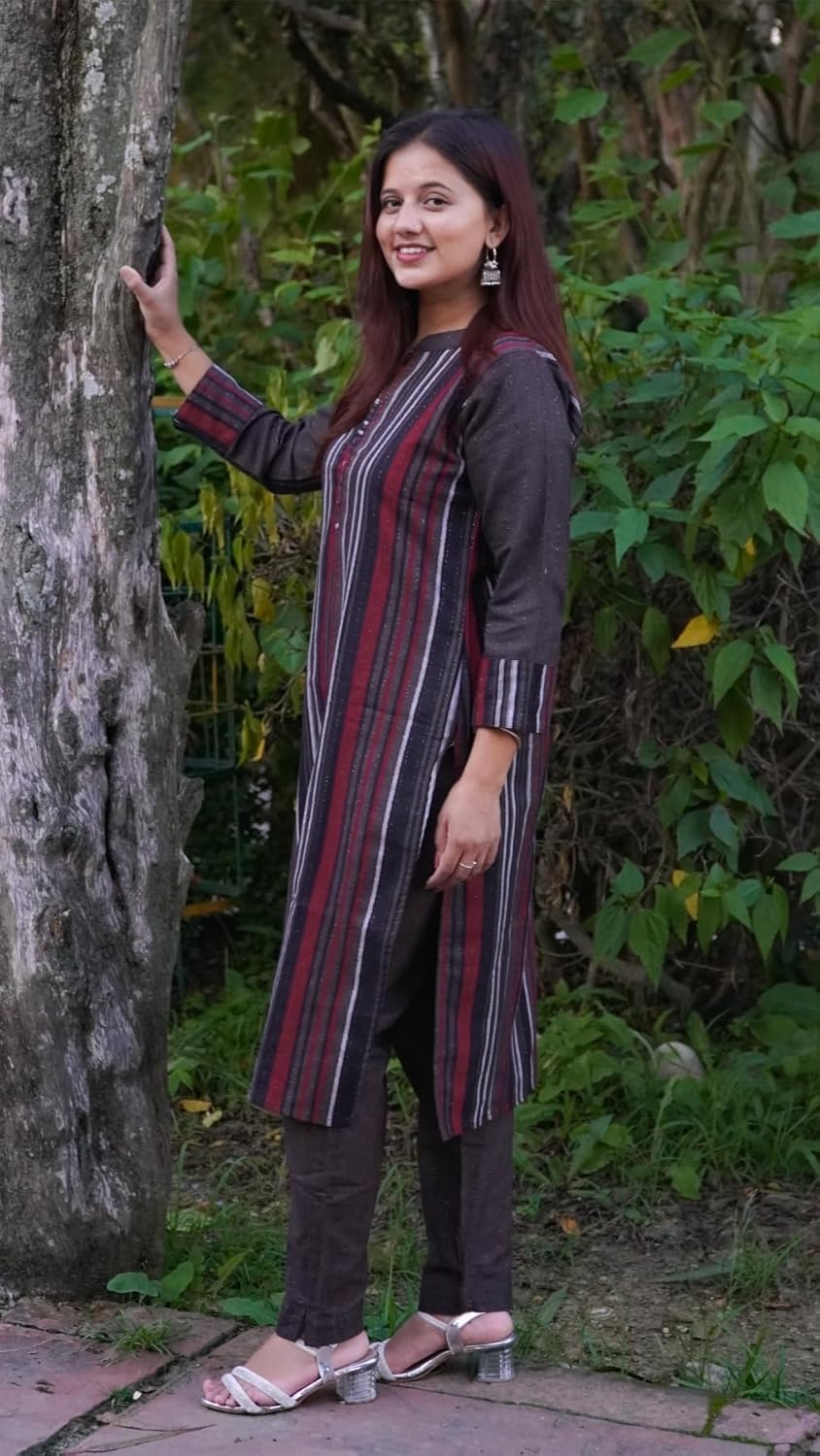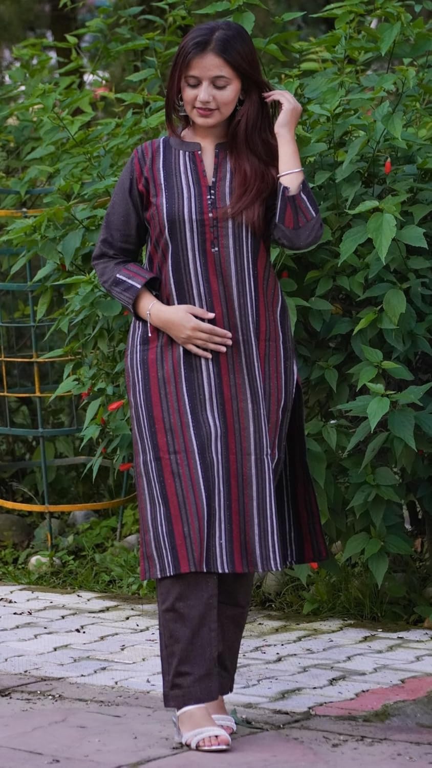 Kurta Details || Fabric : Woolen || Color : Brown|| Pattern : Stripped || Style:- Straight Kurta || Neck : V-Collard Neck || Sleeve : 3/4 Sleeve || Length : calf LengthBottom Details || Bottom Fabric : Woolen || Bottom Color : Brown