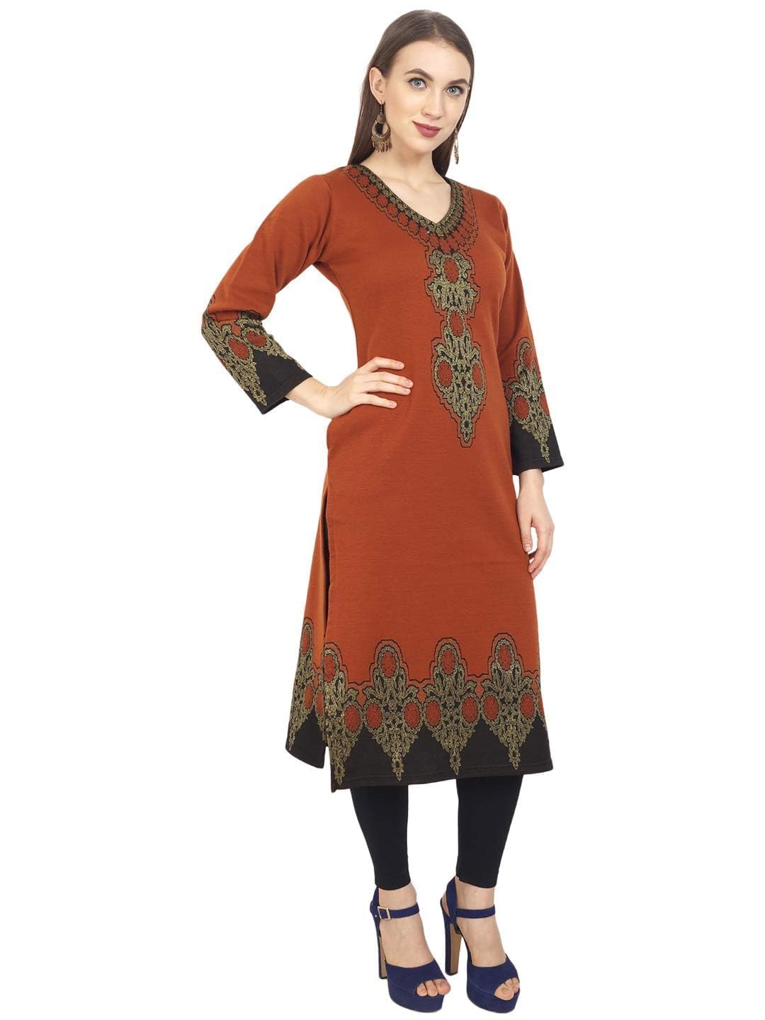 Stay warm and stylish this winter with the Rosary Women’s Woolen Jacquard Straight Fit Kurti. Crafted from soft woolen fabric with elegant jacquard knitting, this calf-length kurti (45–46 inches) offers both comfort and sophistication. The straight fit, full sleeves, and mandarin collar with a V-neckline create a flattering silhouette suitable for all body types. Designed for functionality, it features two practical side pockets—perfect for daily wear. Whether you’re heading to a casual outing, festive event, or a winter get-together, this versatile ethnic kurti pairs effortlessly with palazzos, jeans, or leggings. Ideal for winter ethnic wear, this kurti combines warmth, elegance, and everyday ease in one stylish piece.