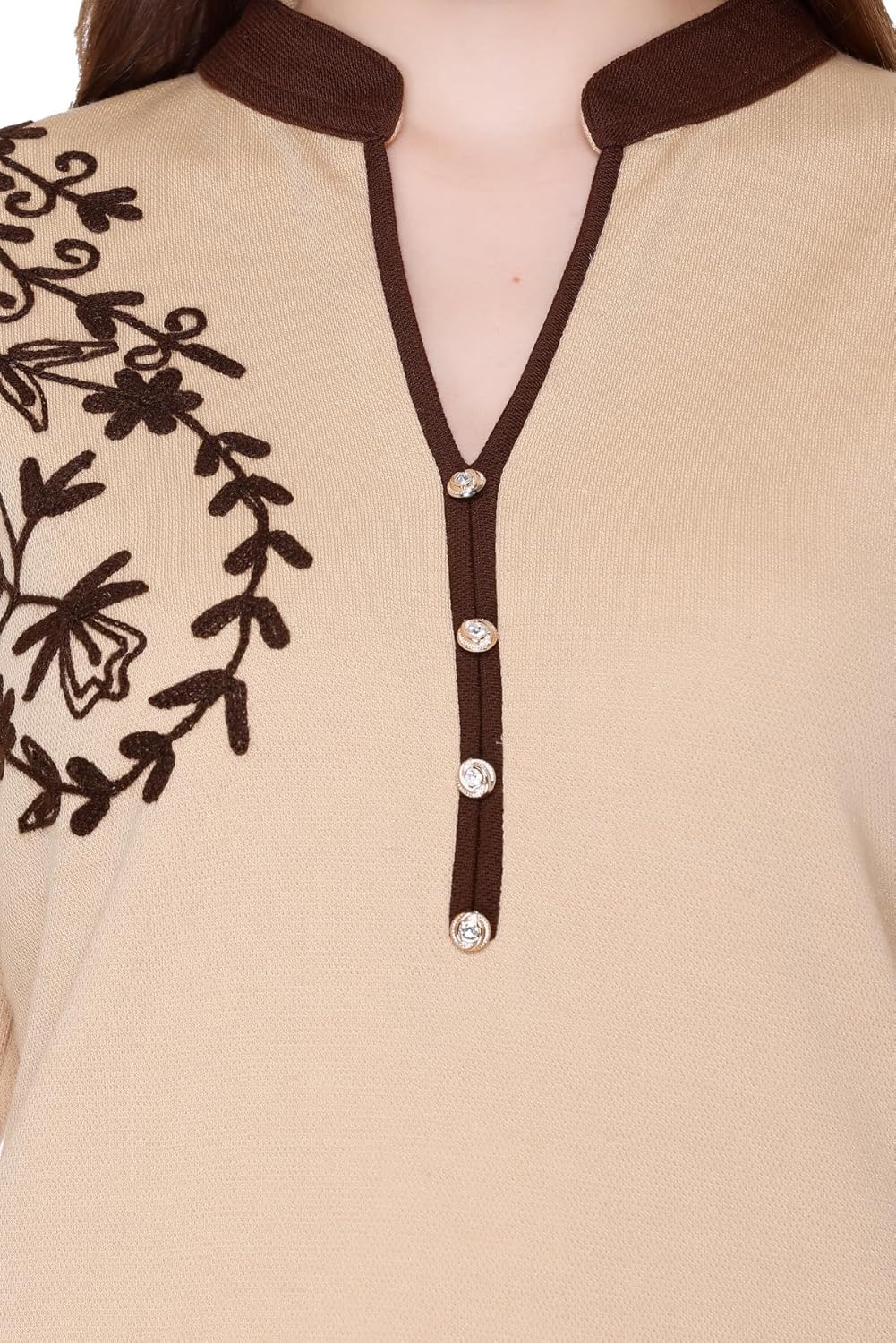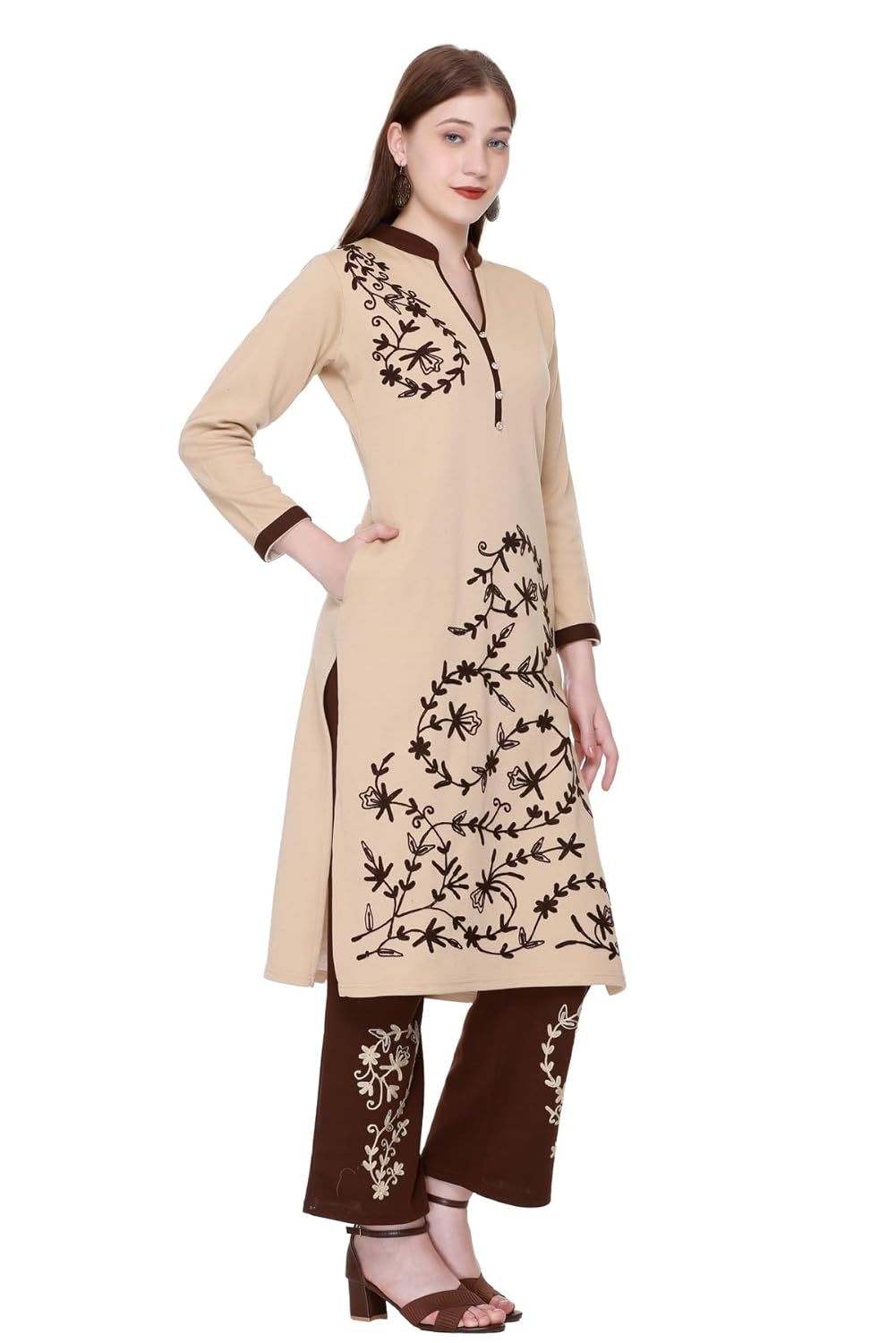 Stay cozy and stylish this winter with our elegant 2-piece wool blend kurti set, crafted from soft and warm fabric ideal for cold weather. The beautifully embroidered kurta features a flattering 45–46 inch straight fit with full sleeves, a stylish Mandarin V-neck, and two practical side pockets for added convenience. Paired with a matching palazzo, this ethnic outfit offers both comfort and sophistication, making it perfect for casual outings, festive gatherings, parties, and all your winter events.