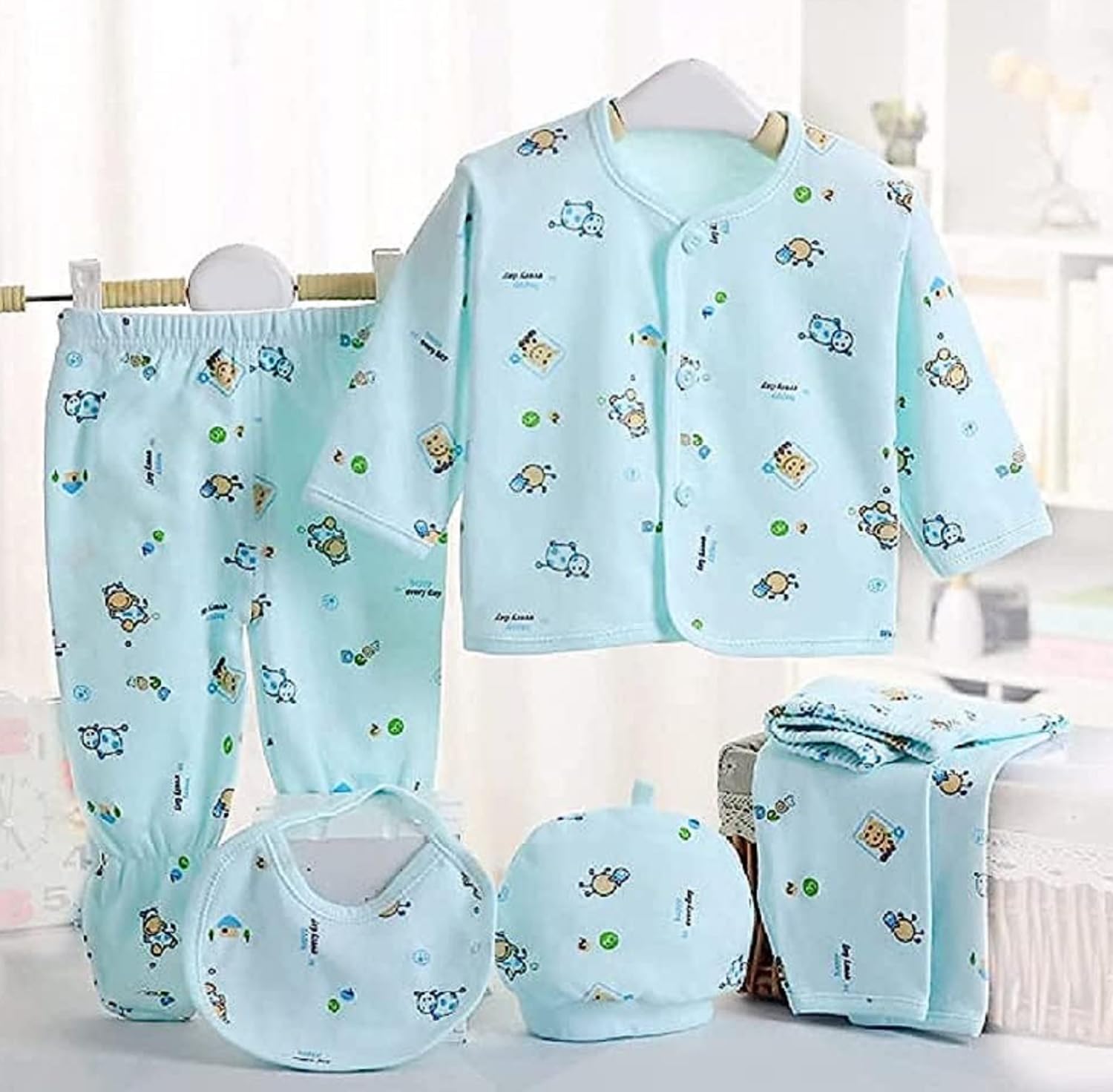 This five-piece set features a T-shirt, two pairs of pants, a cap, and a bib for complete baby comfort.