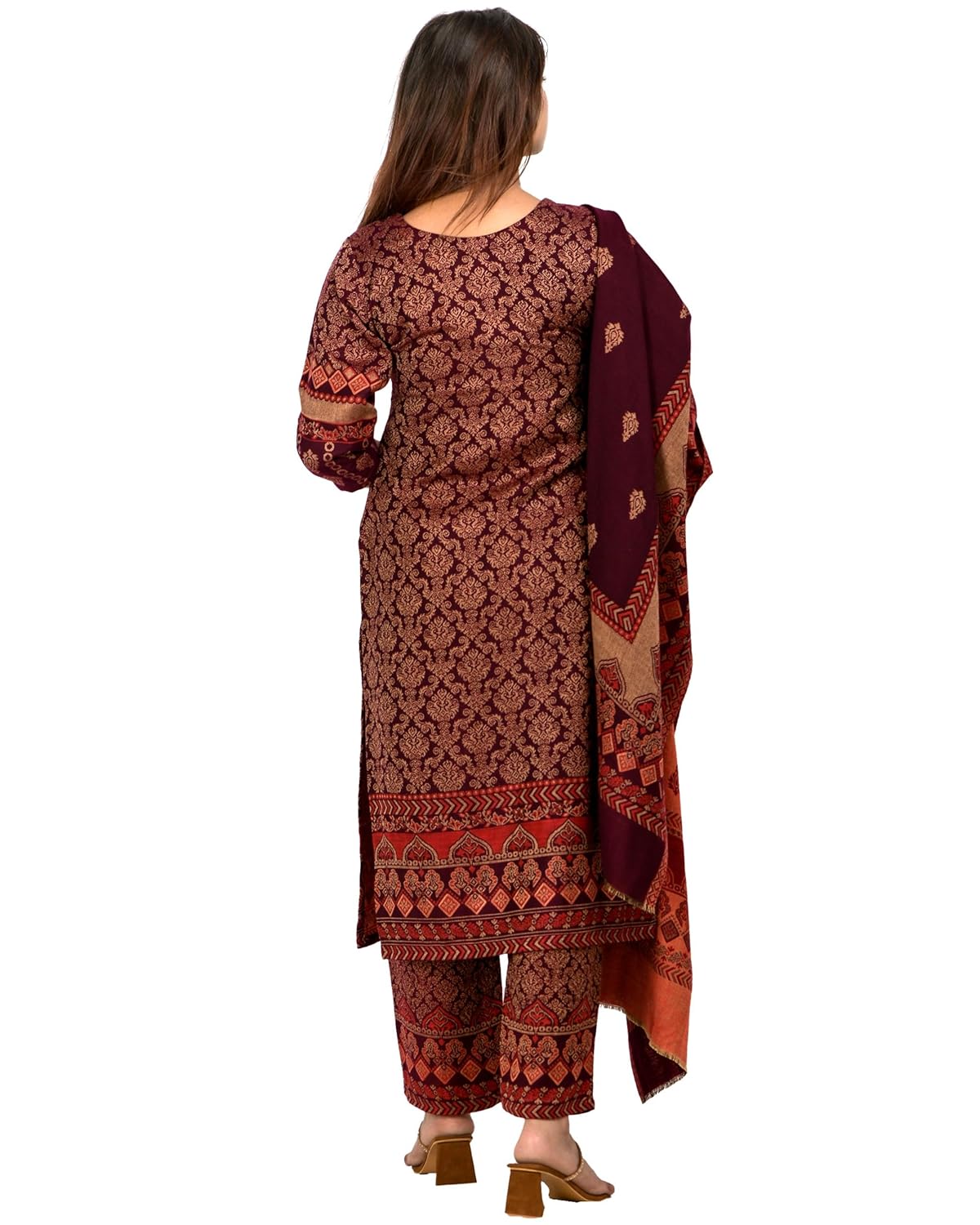 This winter suit having a unique ethnic design has been crafted using a precise weaving technique. The combination of Acro wool and soft Viscose fabric will keep you warm and at ease all day long. This Salwar Kameez suit with overall self-embroidery also comes with a large matching shawl making it look more elegant. The bottom can be stitched as a Palazzo, Pant, Patiala, Churidar or a Normal Salwar. Kurta size: 2.25m; Salwar size:2.5m; Dupatta size: free. This woolen suit is ideal for casual, party and festive wear.